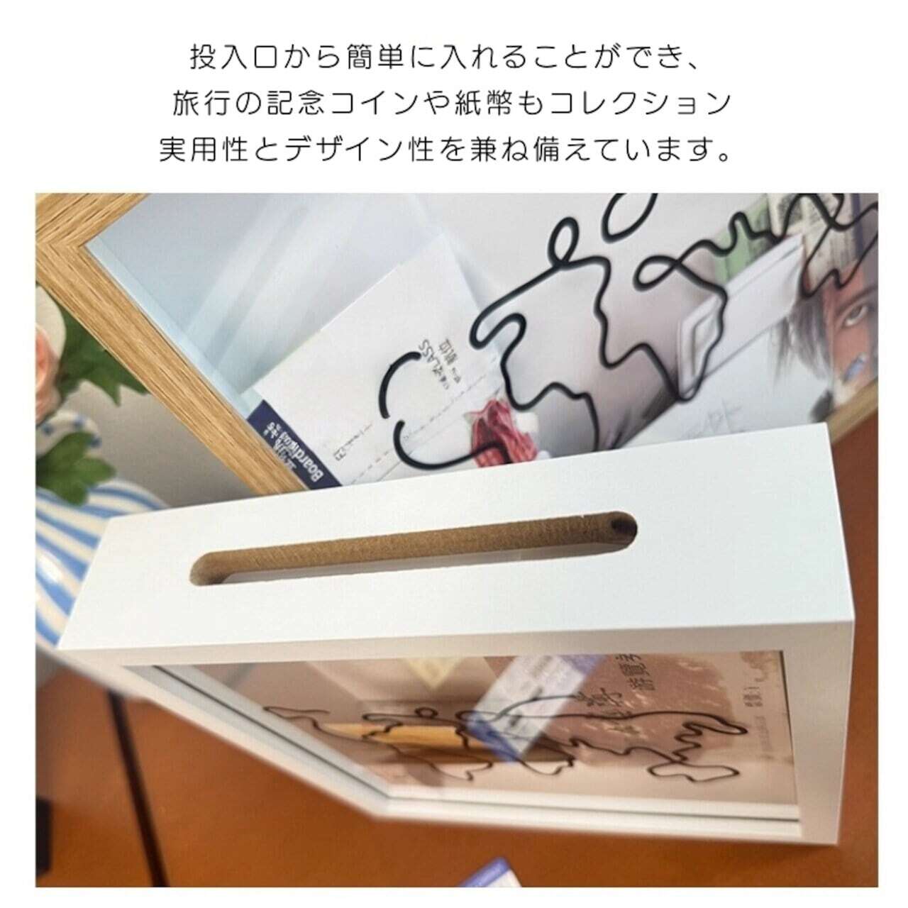 上部のスリットから簡単に入れられるデザインで、インテリアとして飾りながら思い出を振り返ることができます。