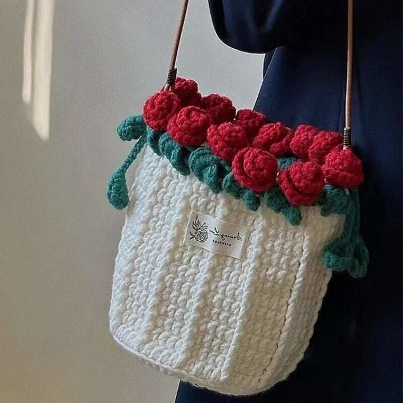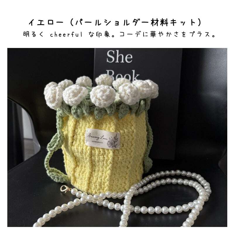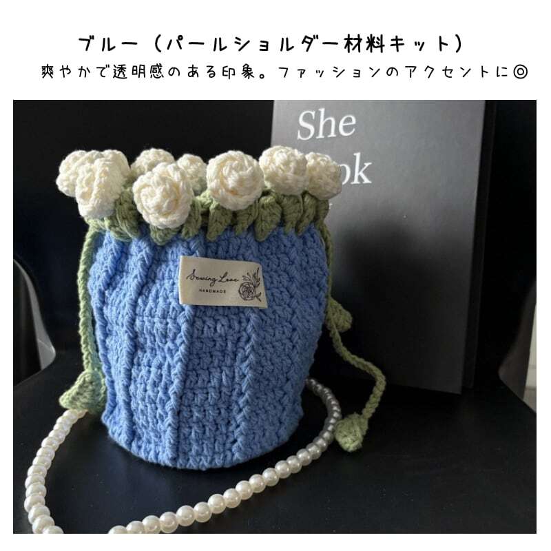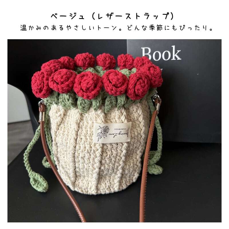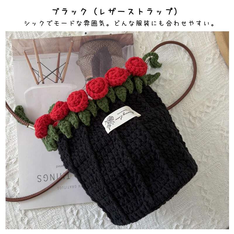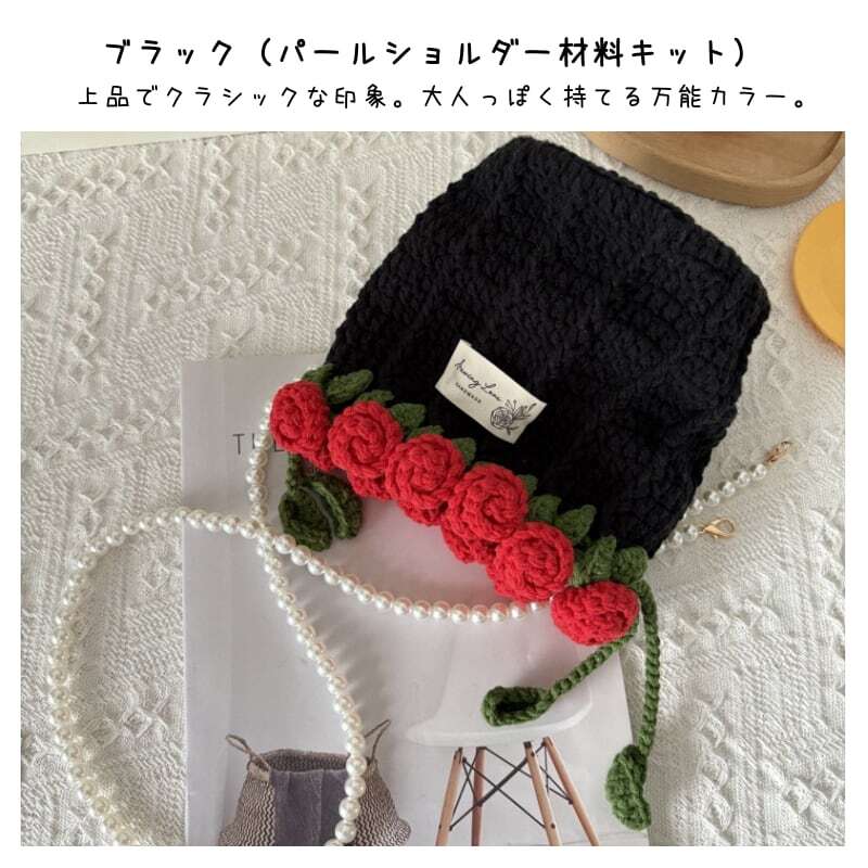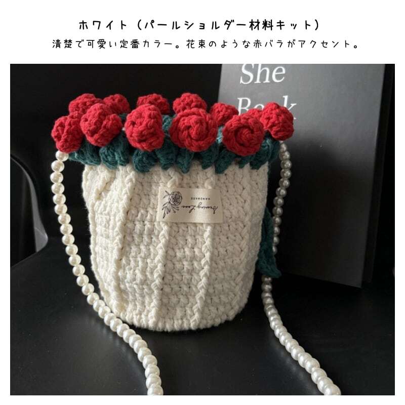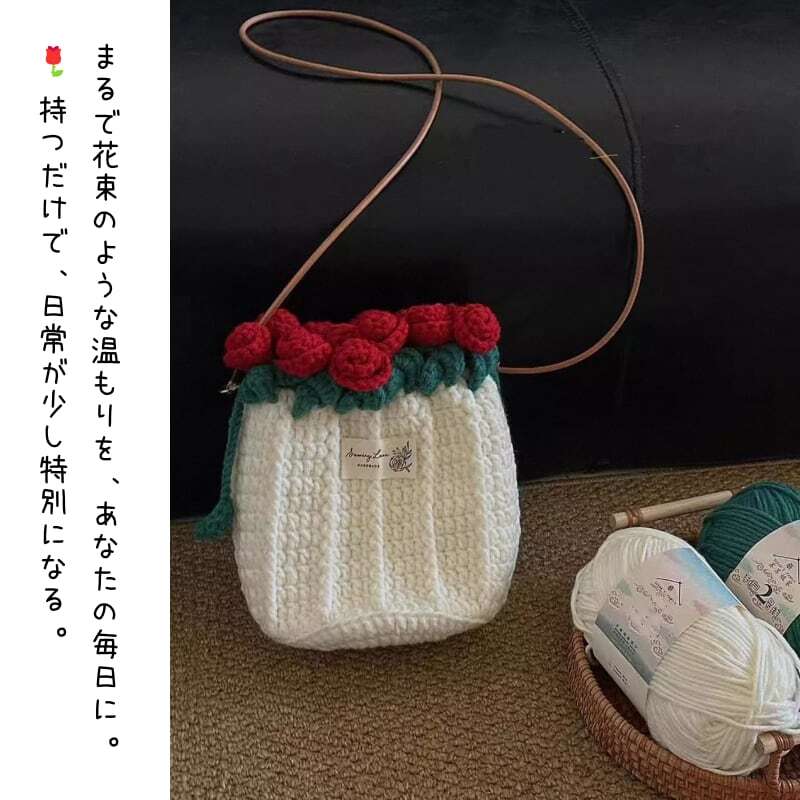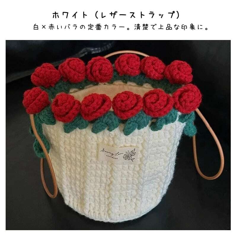 Y 119 . 【ご購入特典】編み方動画レッスンプレゼント 手編みローズバッグ ハンドメイド毛糸ショルダーバッグ 花束デザイン巾着バッグ 材料キット&完成品 パール&レザーストラップ全7色 | GIFTUU