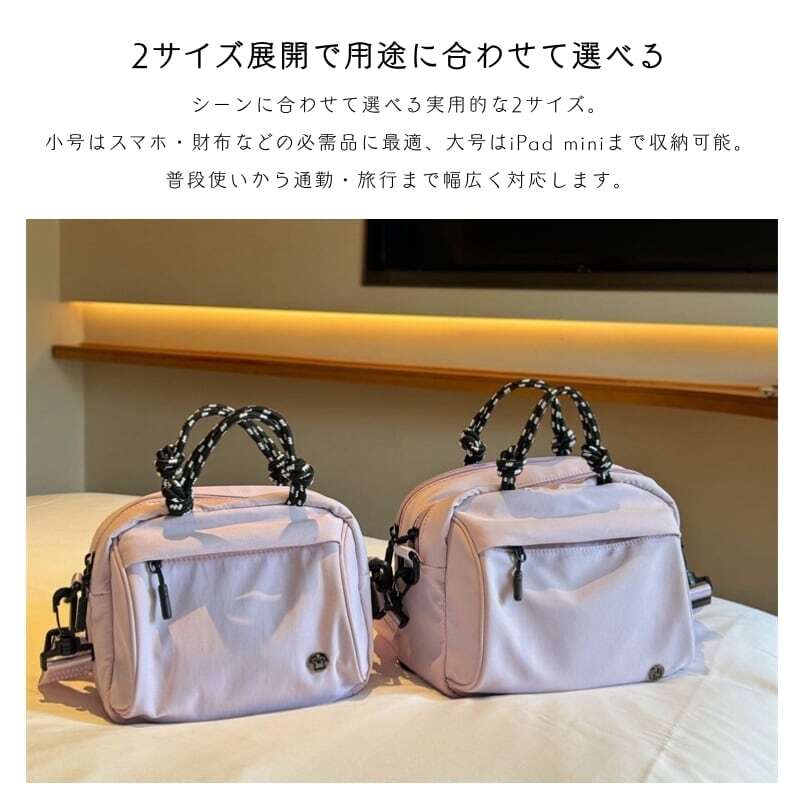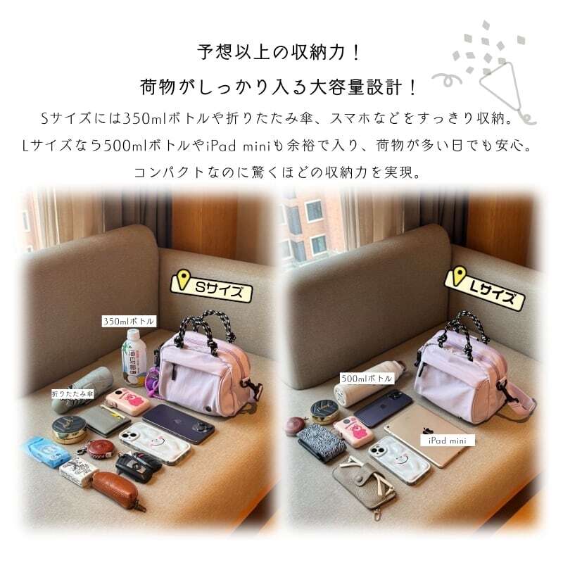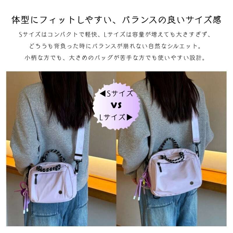 Lサイズはリュックとしても使える4WAY仕様、Sサイズは手提げ・肩掛け・斜め掛けの3WAYに対応。