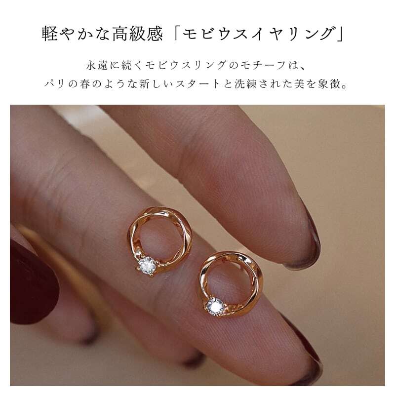 永遠に続くモビウスリングのモチーフは、パリの春のような新しいスタートと洗練された美を象徴。耳たぶに優しいシリコンクッション付き耳夾と、敏感肌対応の925銀ピアス、2つのスタイルで“装う歓び”をお届けします。
