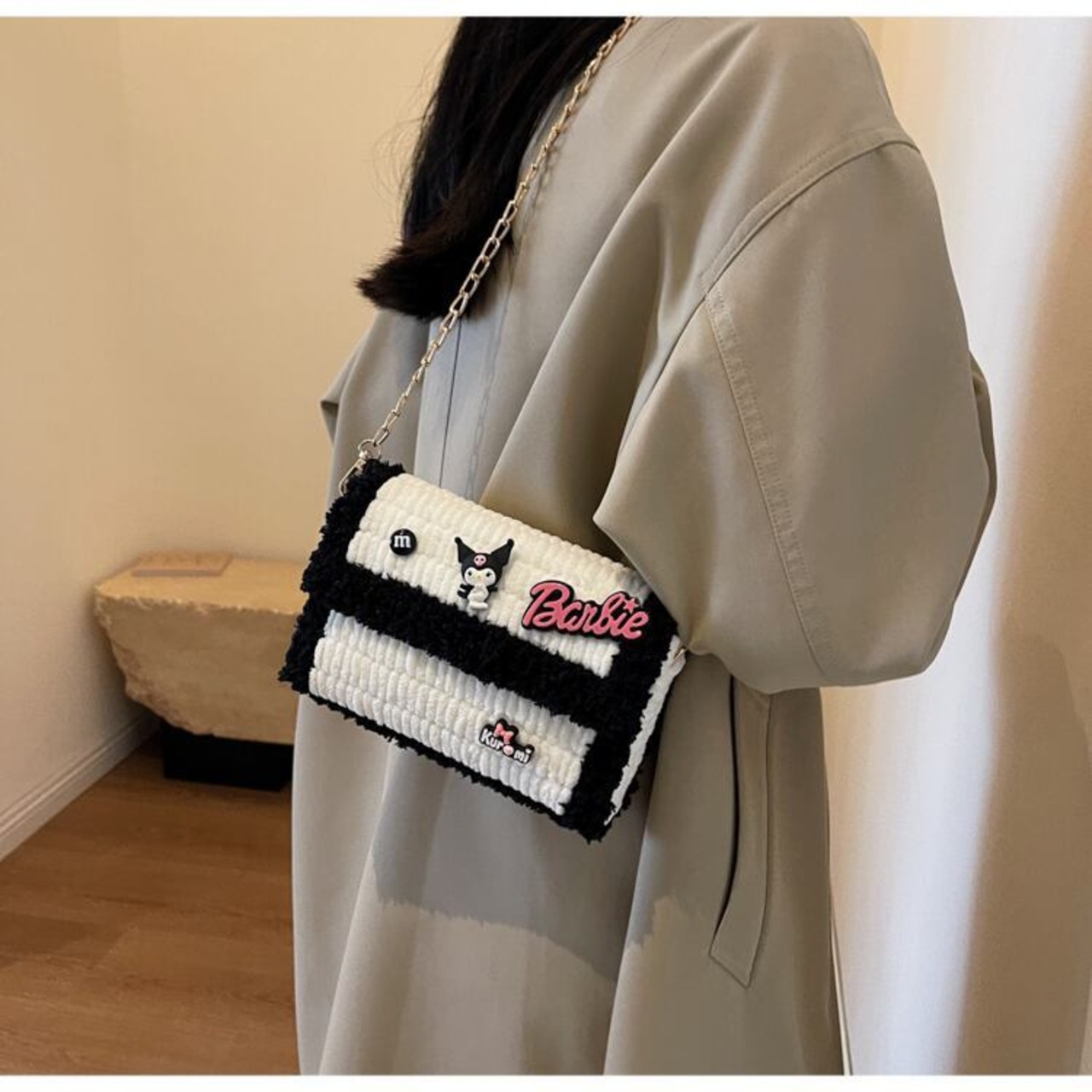 人気キャラクター「クロミ」の特徴を捉えた可愛らしいデザイン。そして、スマートフォンや財布、ポーチなど日常の必須小物が収まる、侮れない収納力を持っています。