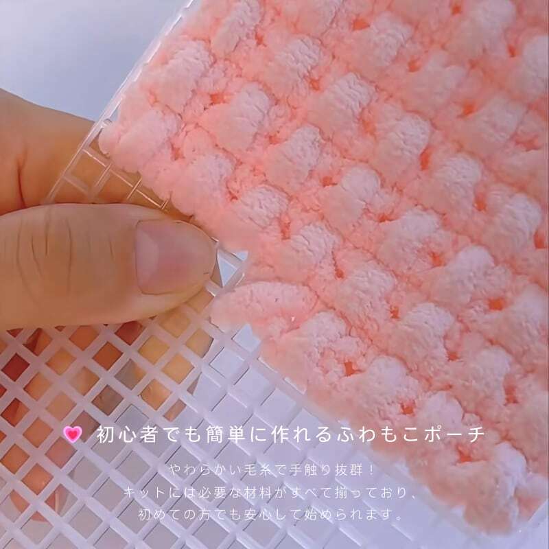 初心者でも簡単に始められるDIY材料キット。ベースのメッシュボードに毛糸を通すだけで、ふっくらかわいいポーチが完成します。