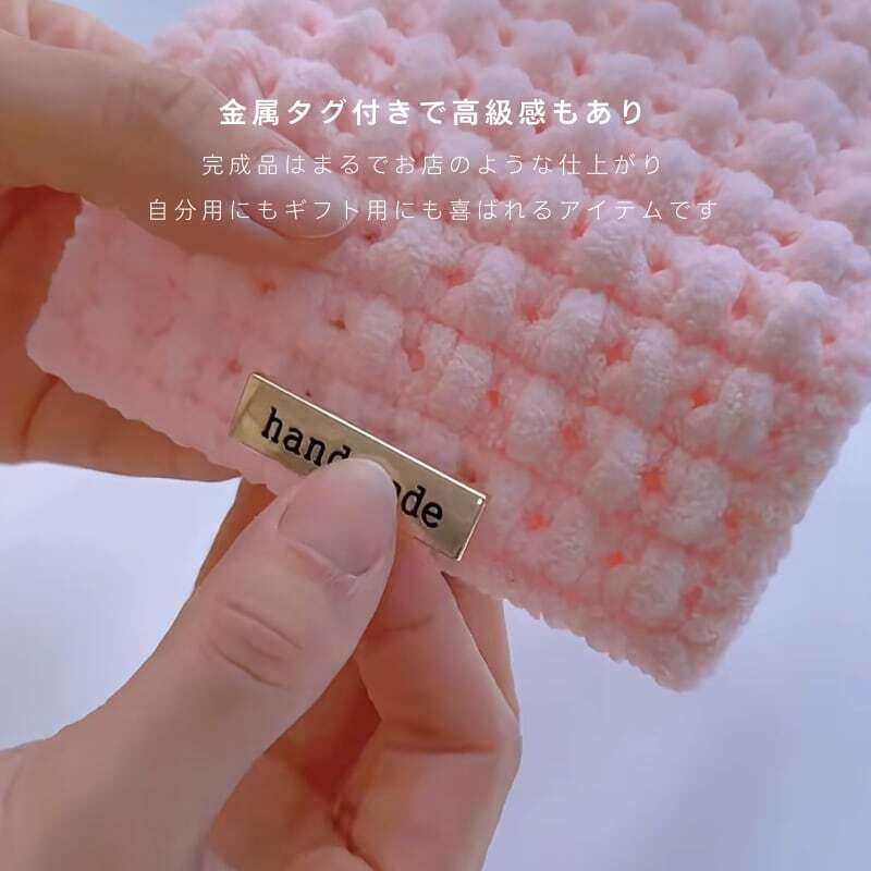 立体感のある編み模様とゴールドの「handmade」タグが高級感を演出。