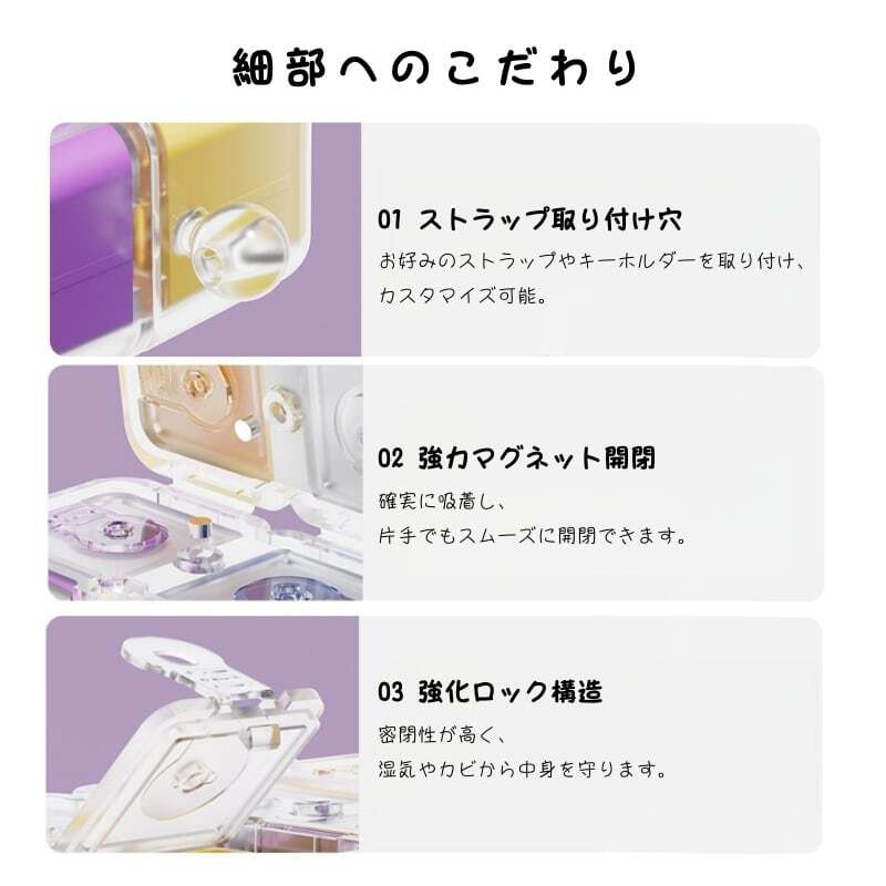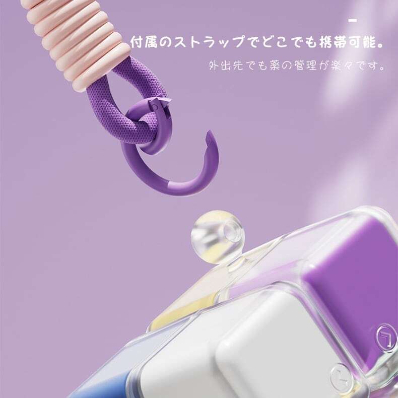 マグネット開閉と高い密閉性で鮮度を守り、付属のストラップで鞄や手首にぶら下げて、外出先でも忘れずに服用できます。