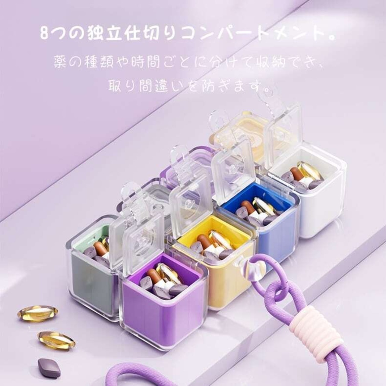コンパクトでありながら8つの独立仕切りを備え、1週間分の薬やサプリメントを種類別・日別に整理収納。
