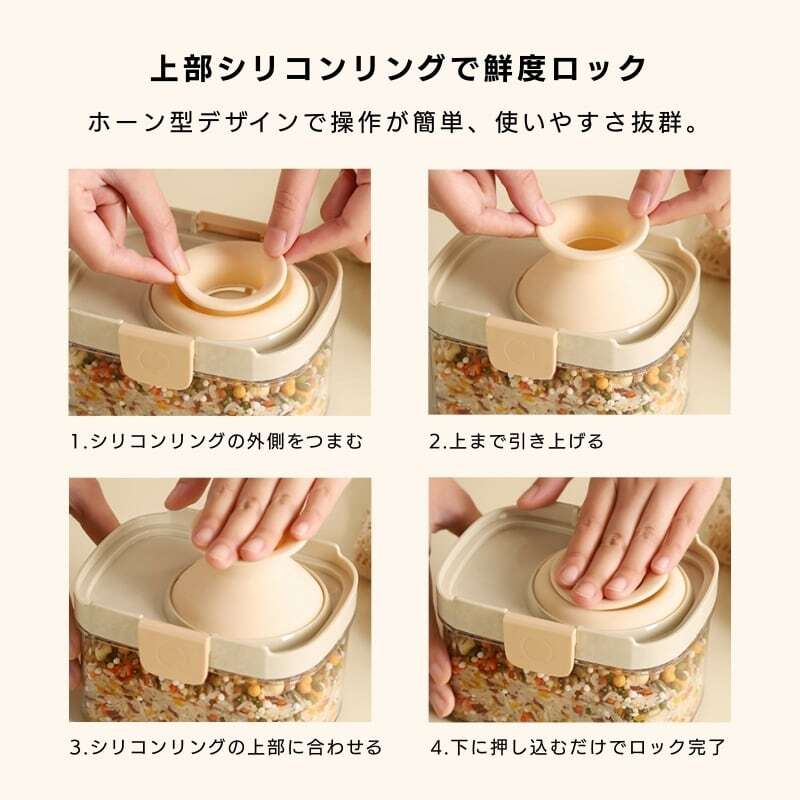 湿気に敏感な食材にはシリコンロック式(柔軟なシリコンがぴったり密封)、毎日使うものにはプレス式(ワンタッチでパチンと閉鎖)。用途と好みで選べます。