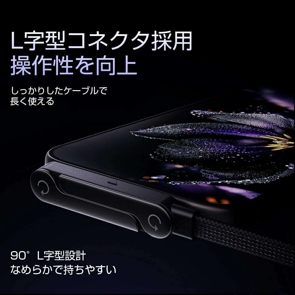 90度に曲がったL字型設計により、充電中もケーブルが手や指の邪魔になりません。動画視聴やゲームプレイ、縦向きでの操作も快適です。