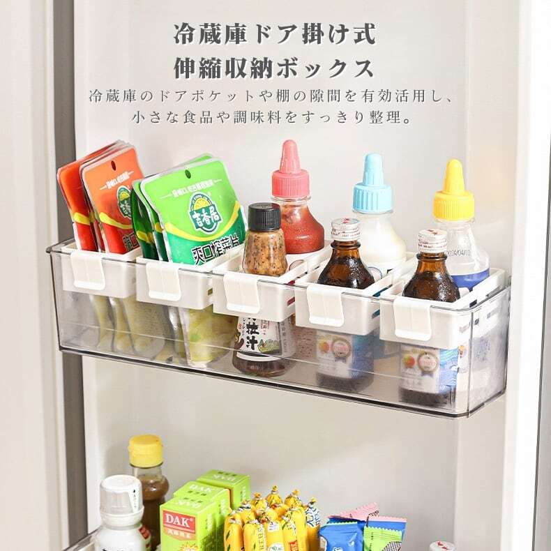 冷蔵庫の「狭すぎて使いづらい隙間」を、便利な収納スペースに変える魔法のようなアイテム、伸縮式冷蔵庫収納ボックス。