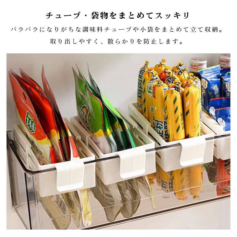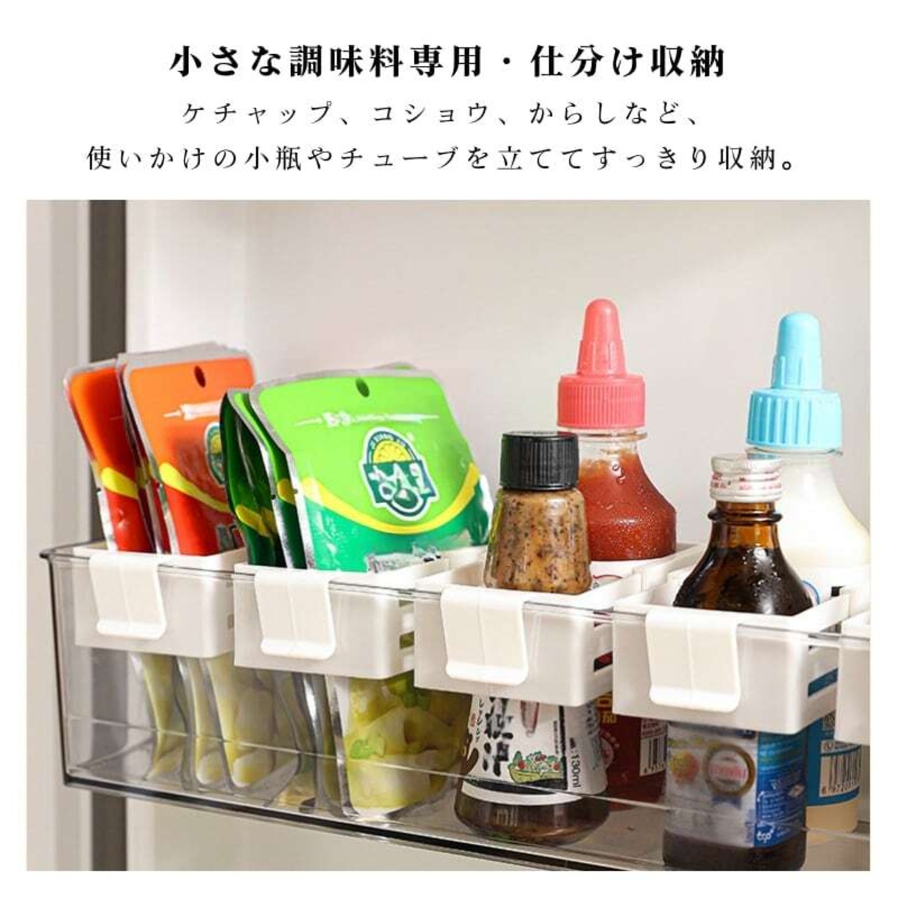 小瓶やチューブなど、バラバラになりがちな食品を立ててすっきり整理整頓。