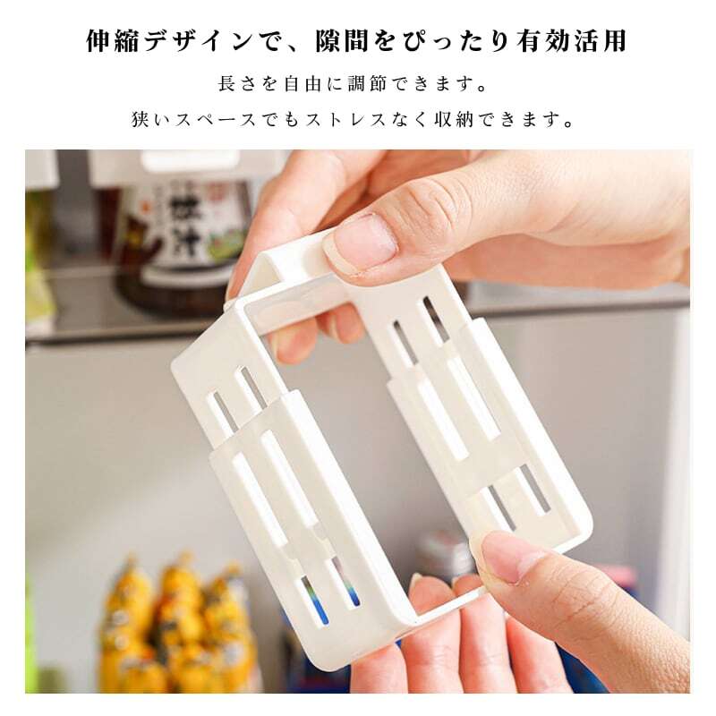 冷蔵庫の棚板の高さや、ドアポケットの奥行きに合わせて、長さを自由に伸縮調節可能(約8〜12cm)。無理な力がいらず、ストレスなく隙間を有効活用できます。