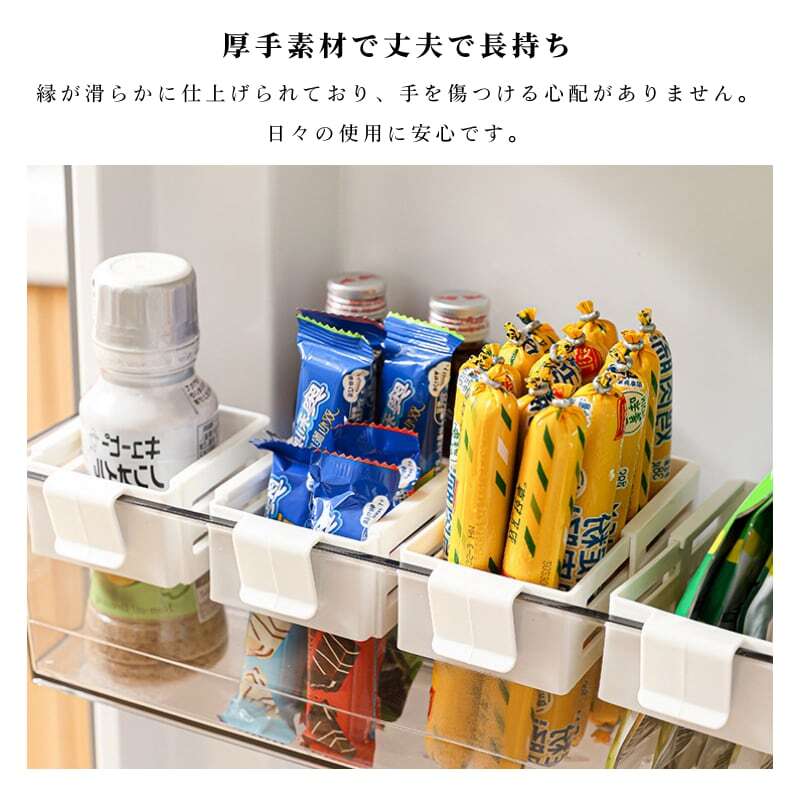 縁が滑らかに加工されており、手を傷つける心配がありません。また、棚板にしっかり引っ掛かる設計で、冷蔵庫の開閉時の振動でもずれ落ちにくいです。