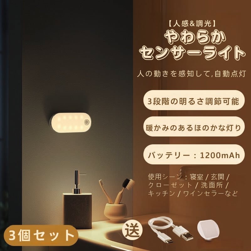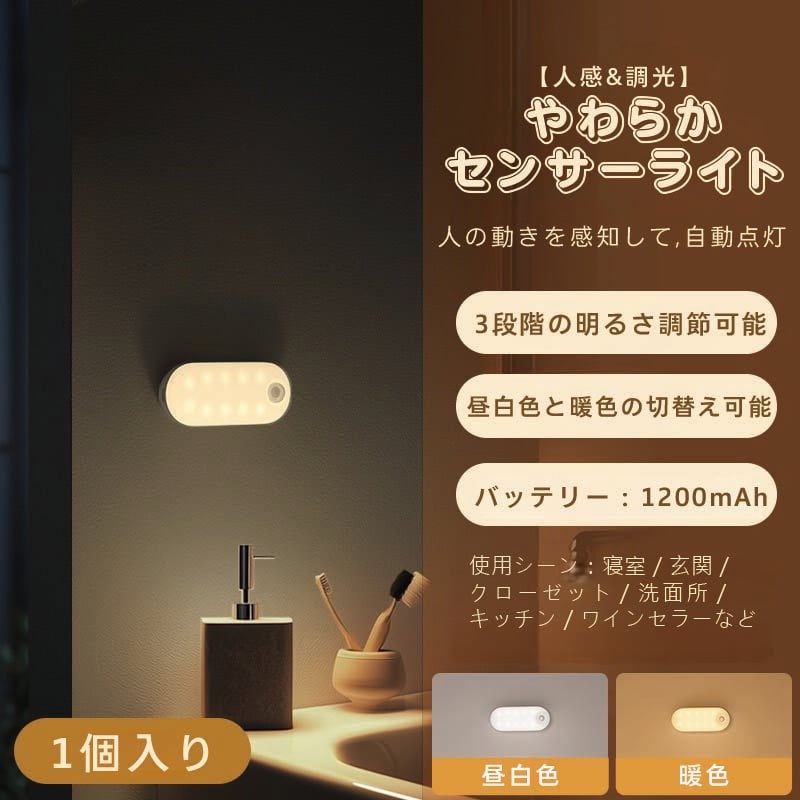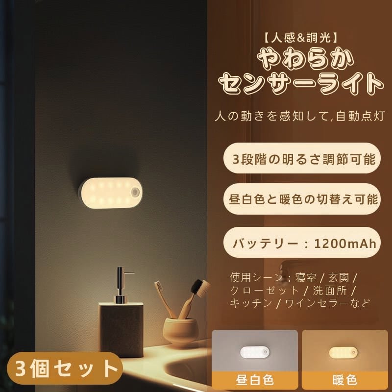 Y 388 . 【冷暖色切替・調光機能付】人感センサーライト 1200mAh 大容量バッテリー マグネット式 寝室 玄関 キッチン 廊下 足元ライト 自動点灯 夜間起きに便利 3段階調光 長時間点灯 省エネ プレゼント ギフト 1個/2個/3個セット