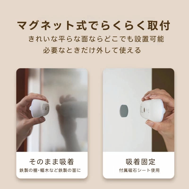 平らな面ならどこでも設置可能。鉄製の面はそのまま吸着、壁面は付属磁石シート使用。