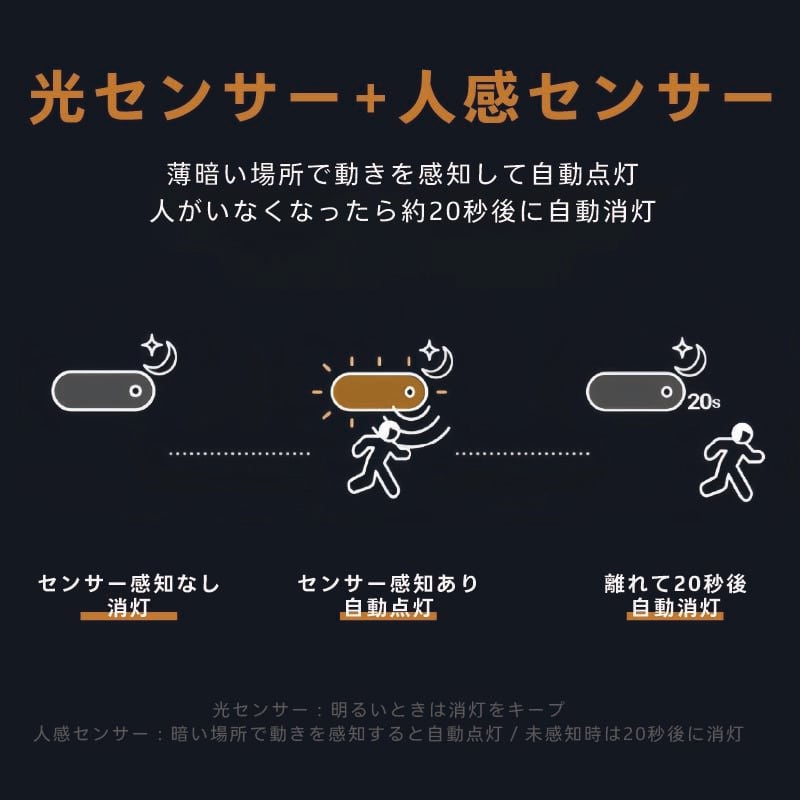 薄暗い場所で動きを感知→自動点灯/人がいなくなったら約20秒後に自動消灯。日中は無駄点灯を防ぐ省エネ設計。