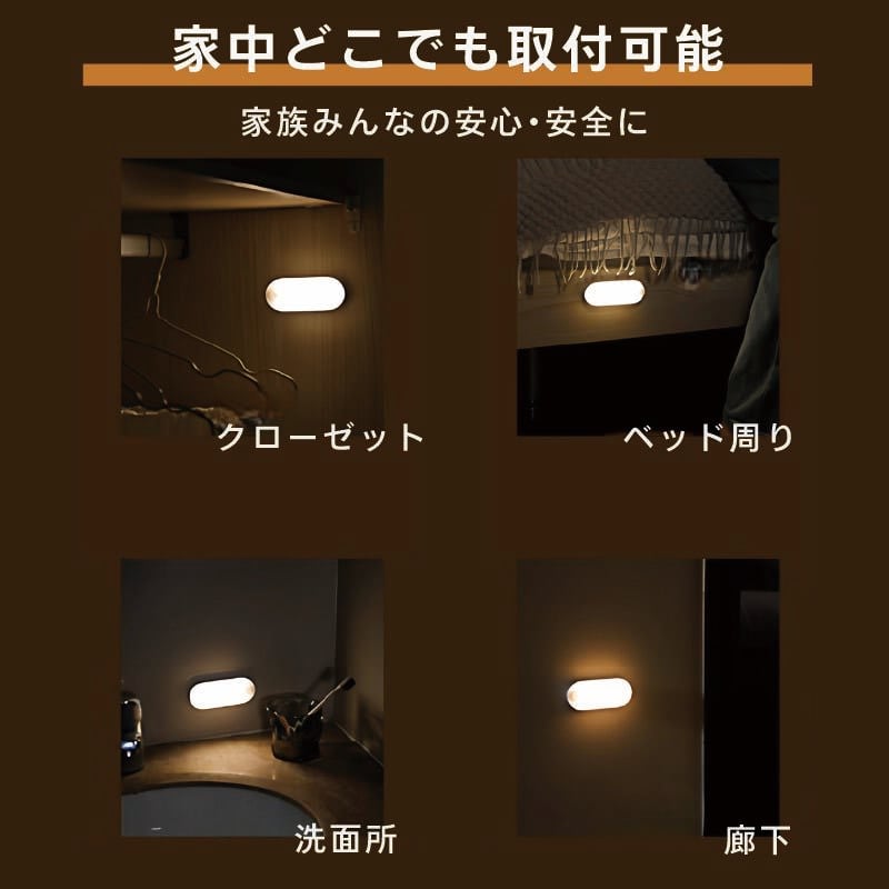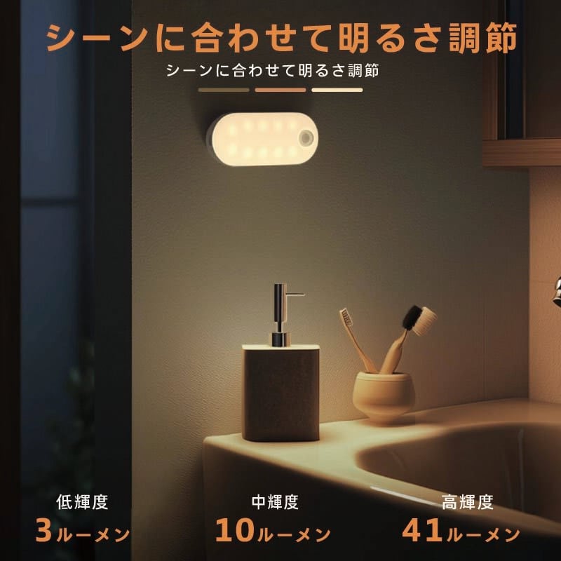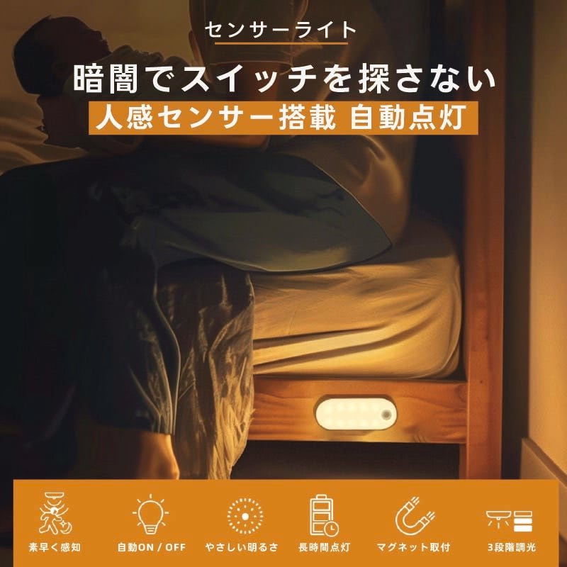 素早く感知、自動ON/OFF、やさしい明るさ、マグネット式、3段階調光と、欲しい機能が揃いました。