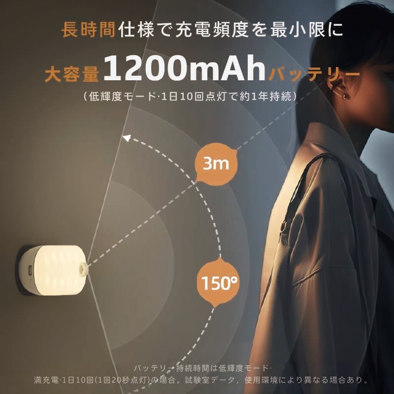 大容量1200mAh。低輝度モード・1日10回点灯で約1年持続。