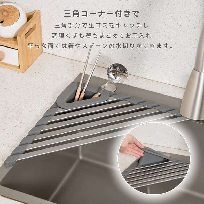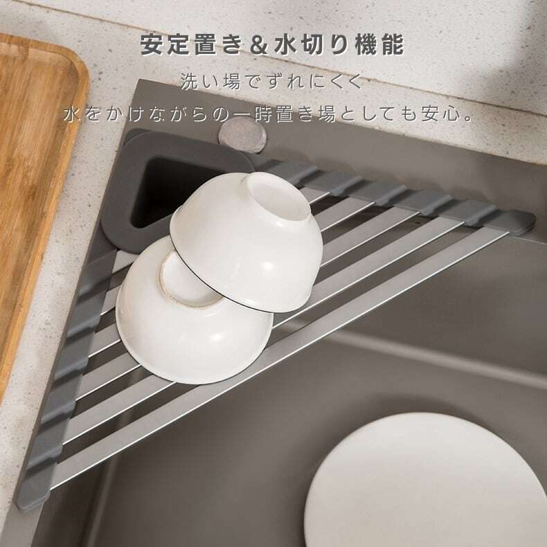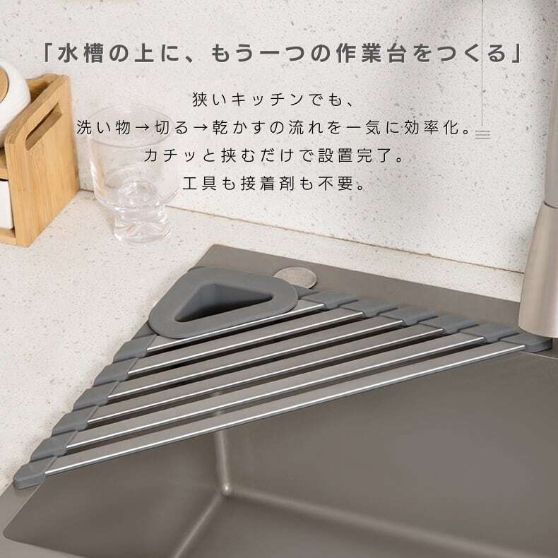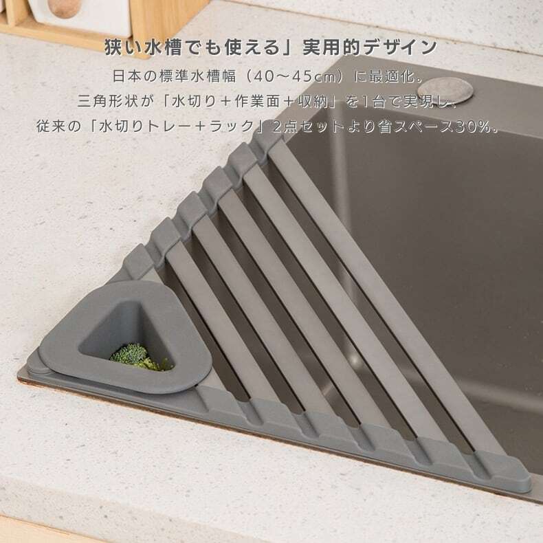 三角形状が「水切り+作業面+収納」を1台で実現し、