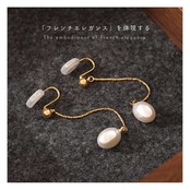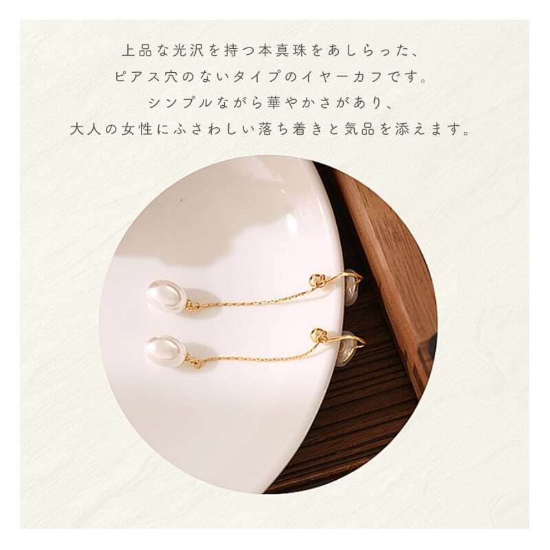 ピアス穴がなくても楽しめる、ロングタイプのパールイヤーカフ。