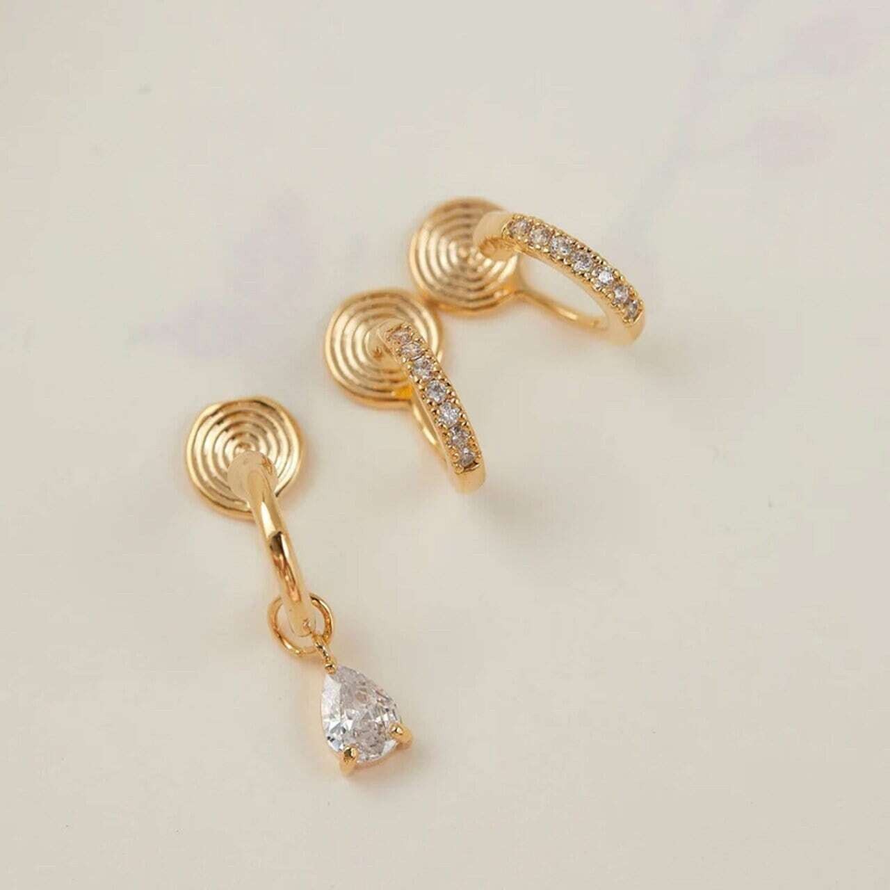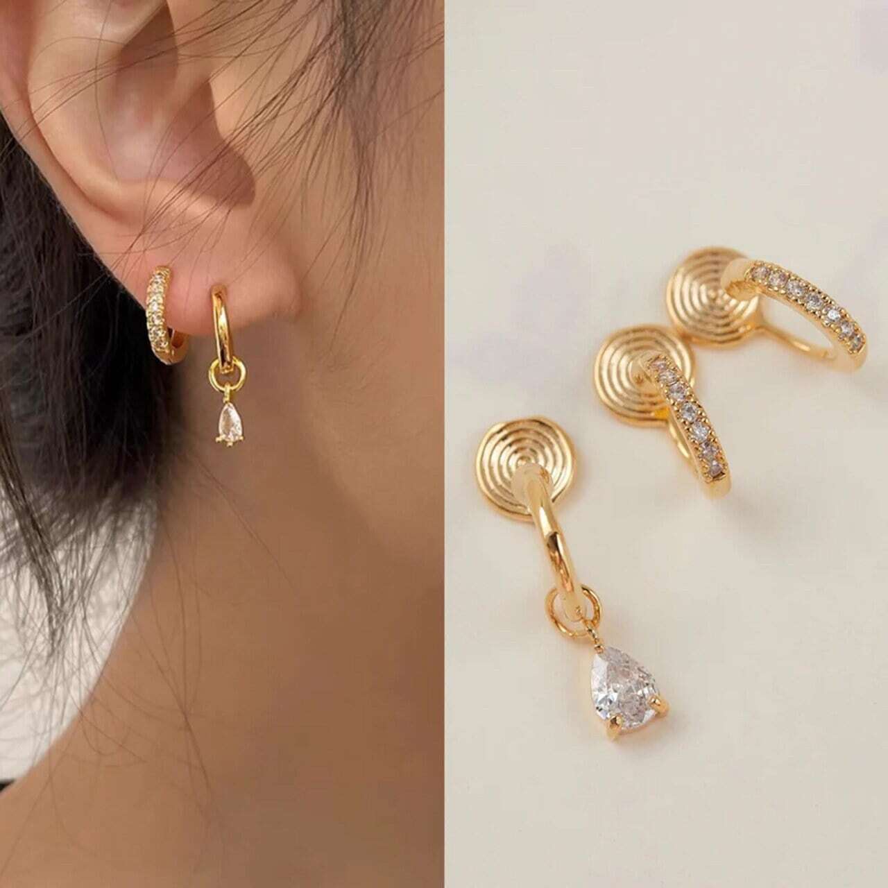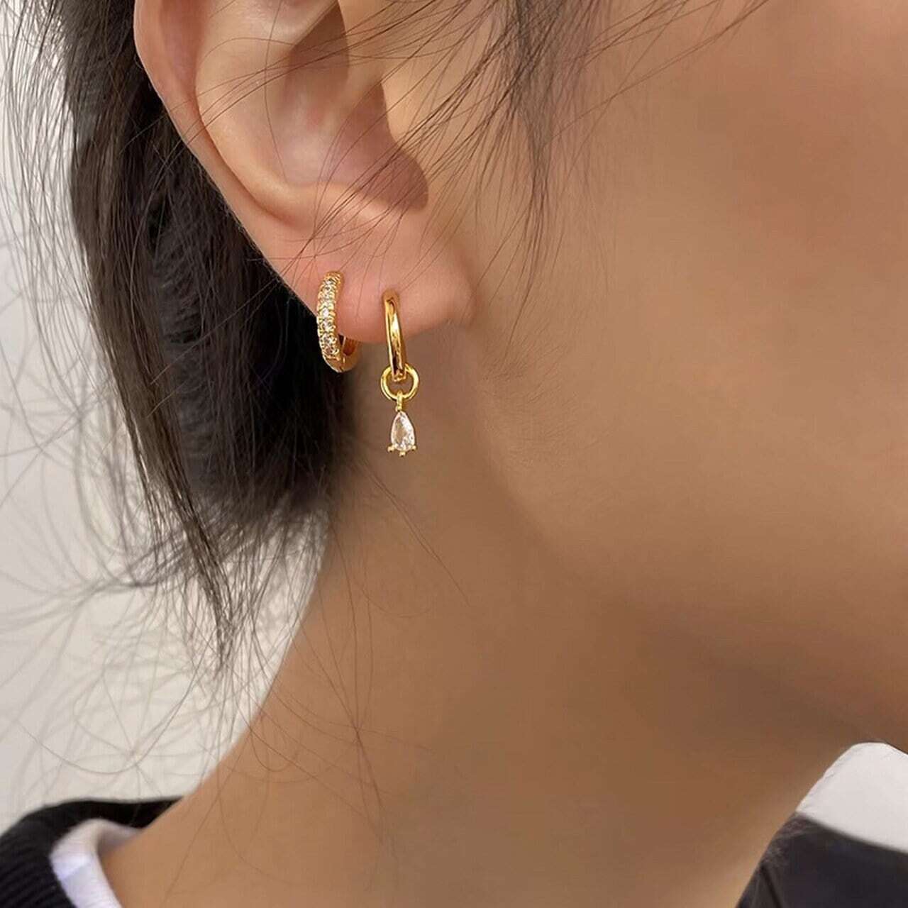2つのフープは繊細なキュービックジルコニアが贅沢に敷き詰められ、耳元で繊細に光を反射します。