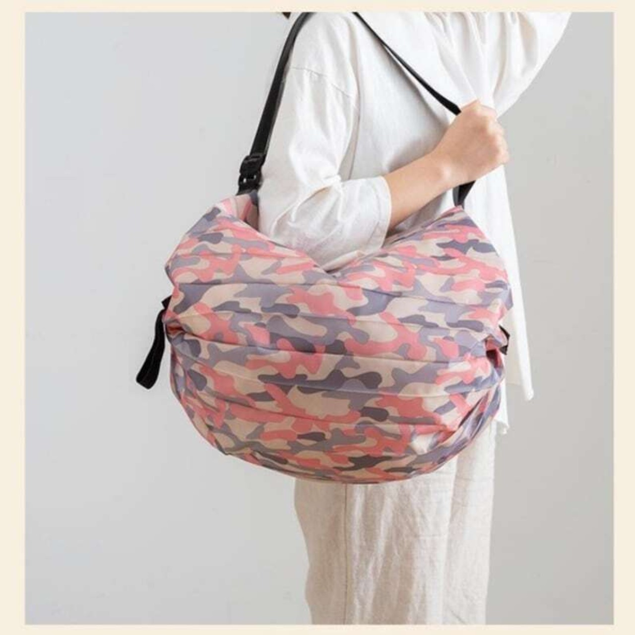 この折りたたみバッグは、広げればたっぷりの買い物を収容し、たたむとスマホより小さいサイズに。