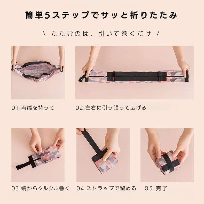 両端を引いてクルクル巻き、付属ストラップで留めるだけの簡単5ステップ。面倒なたたみ方は一切不要で、常に整った状態を保てます。