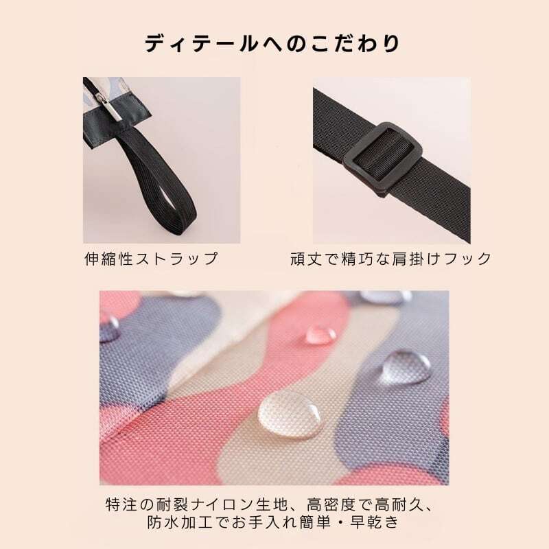 素材: 高密度耐裂ナイロン(防水加工)、ポリエステルストラップ、プラスチックフック