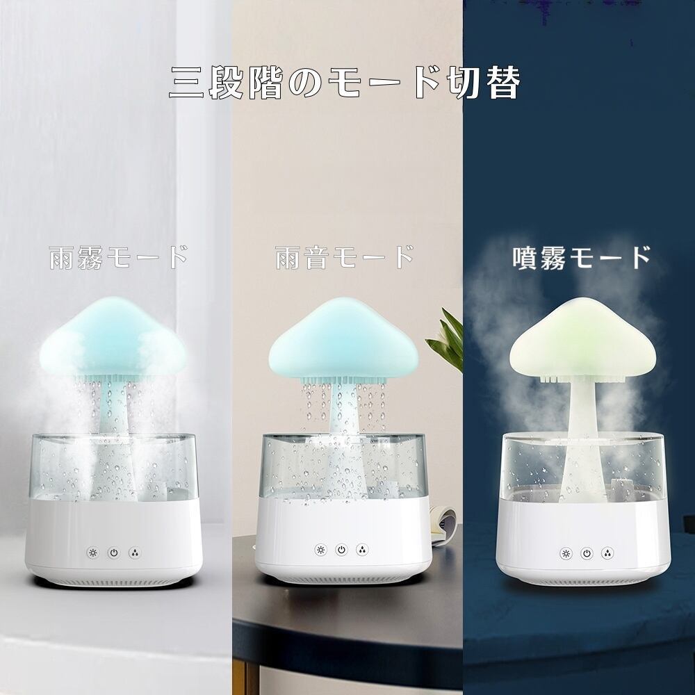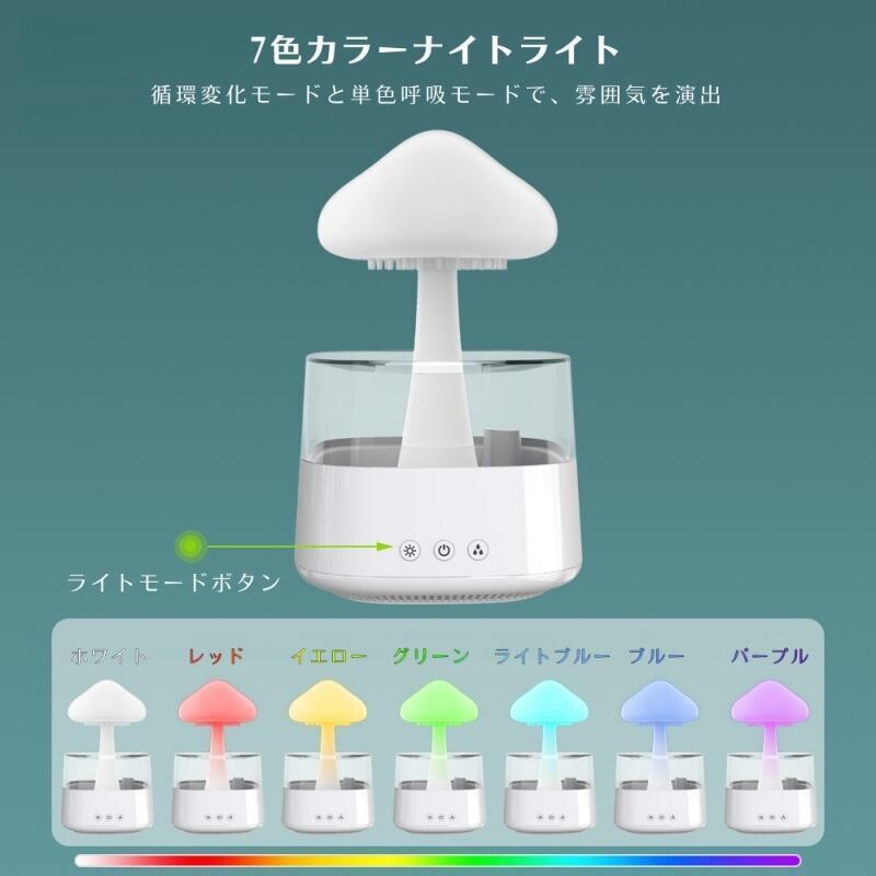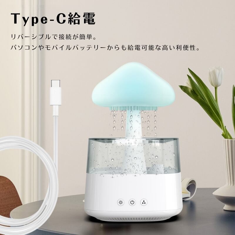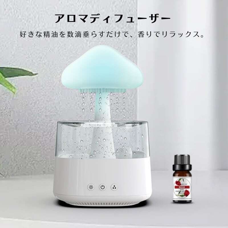 見ているだけで癒やされるマッシュルーム雲から、本物のように雨が降り注ぎます。その音と、ほのかな光、そして好きな香りが、あなたのデスクやベッドサイドを最高の安らぎ空間に変えます。