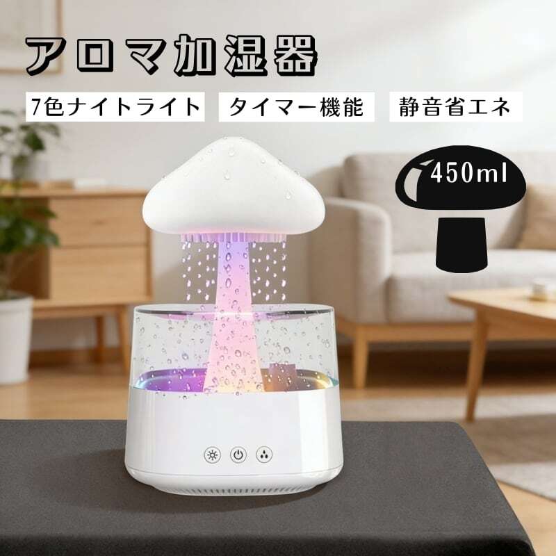 Y 152 . アロマ加湿器 マッシュルームクラウド アロマディフューザー 雨音 7色ナイトライト タイマー 静音 省エネ Type-C 450ml ベッドサイド オフィス ギフト