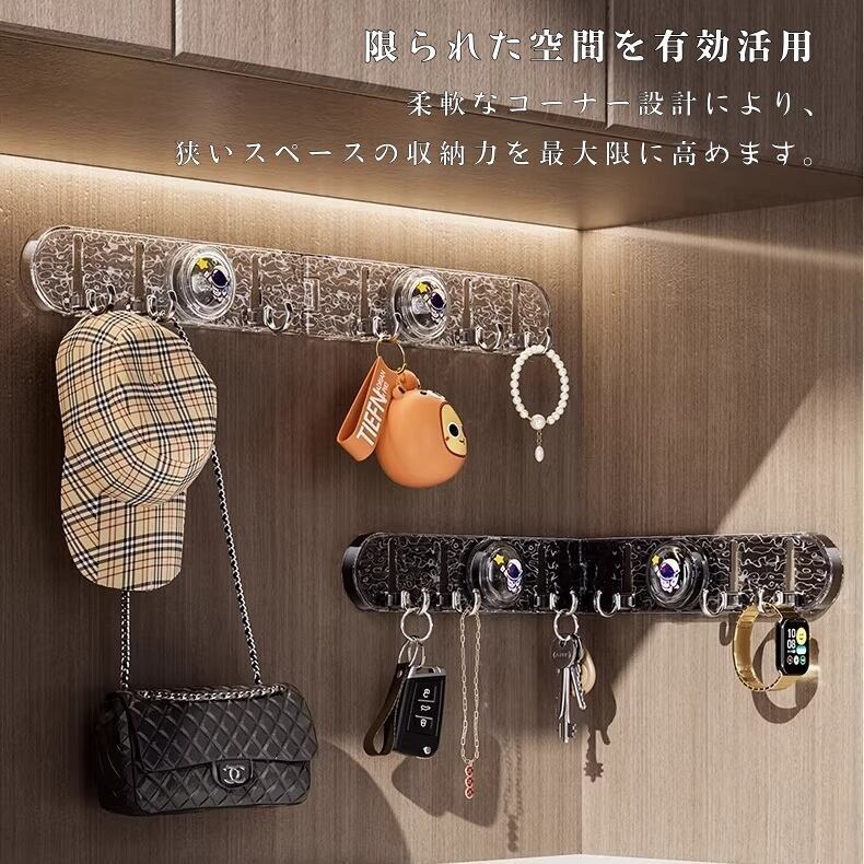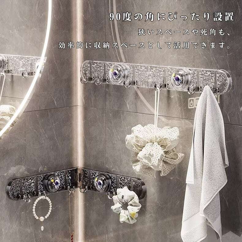 フックが自由に回転し、90度の角にもぴったり設置可能。タオル、鍋つかみ、小物など、あらゆる物の収納に活用でき、死角スペースを有効活用します。