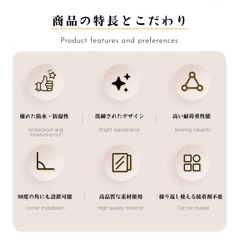 単なる工具を超えた、上質なデザイン性。光で優雅な陰影を生み、浴室やキッチンの雰囲気を高めるスマートな収納アイテムです。