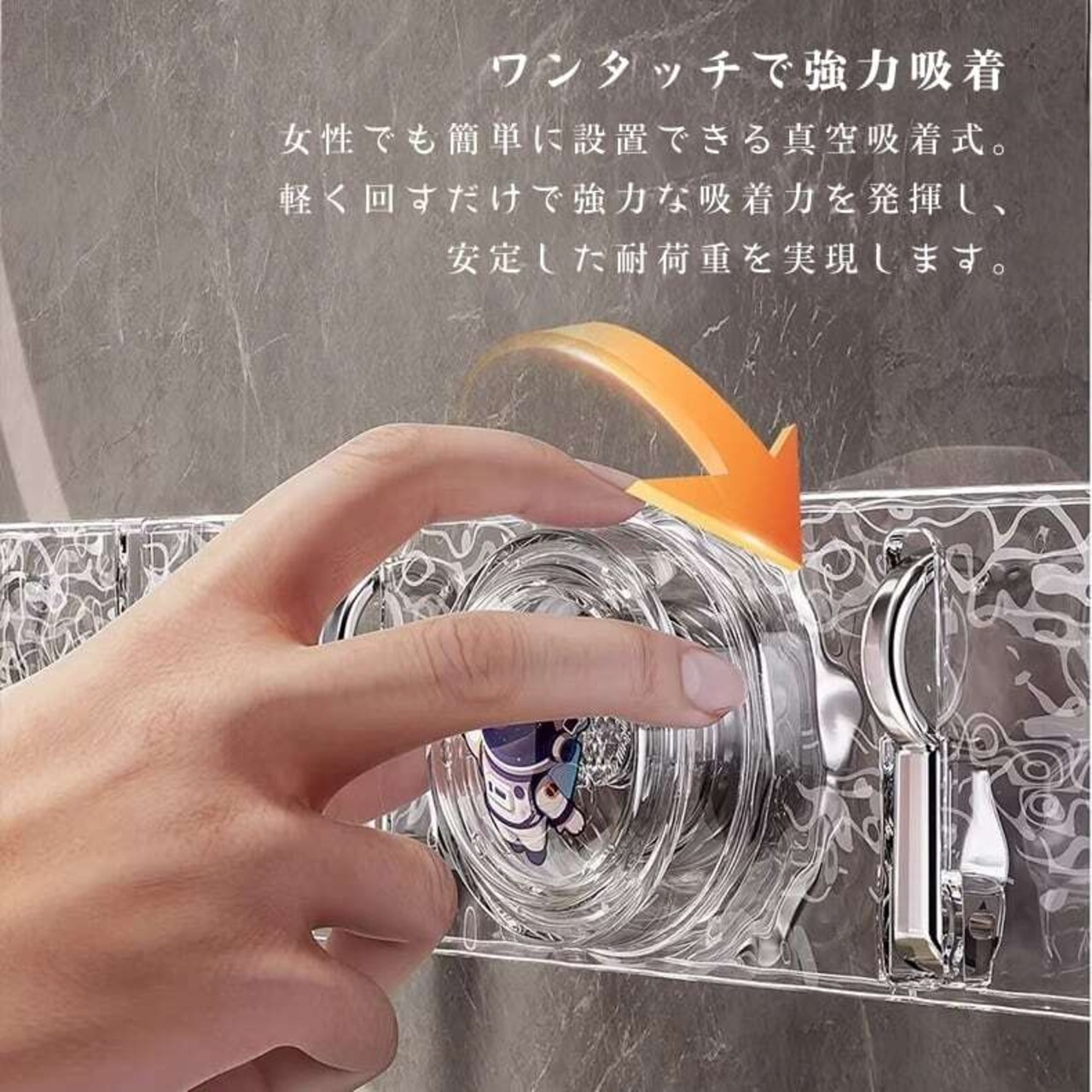 軽く回すだけで真空状態を生成。女性でも確実に設置でき、しっかりとした耐荷重性で日常的な収納を安心サポート。