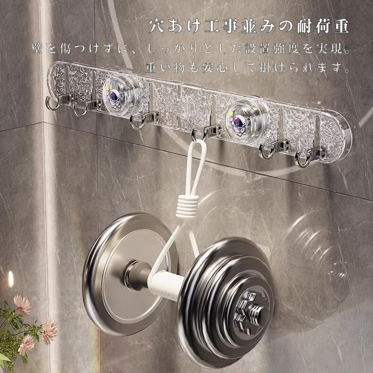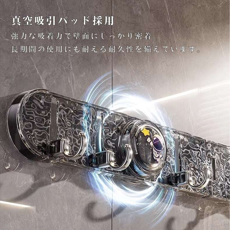 ドリル不要、接着剤不要。シリコン吸盤が真空状態を作り出し、滑らかな壁面に強力に吸着。取り外しも簡単で、跡形も残しません。