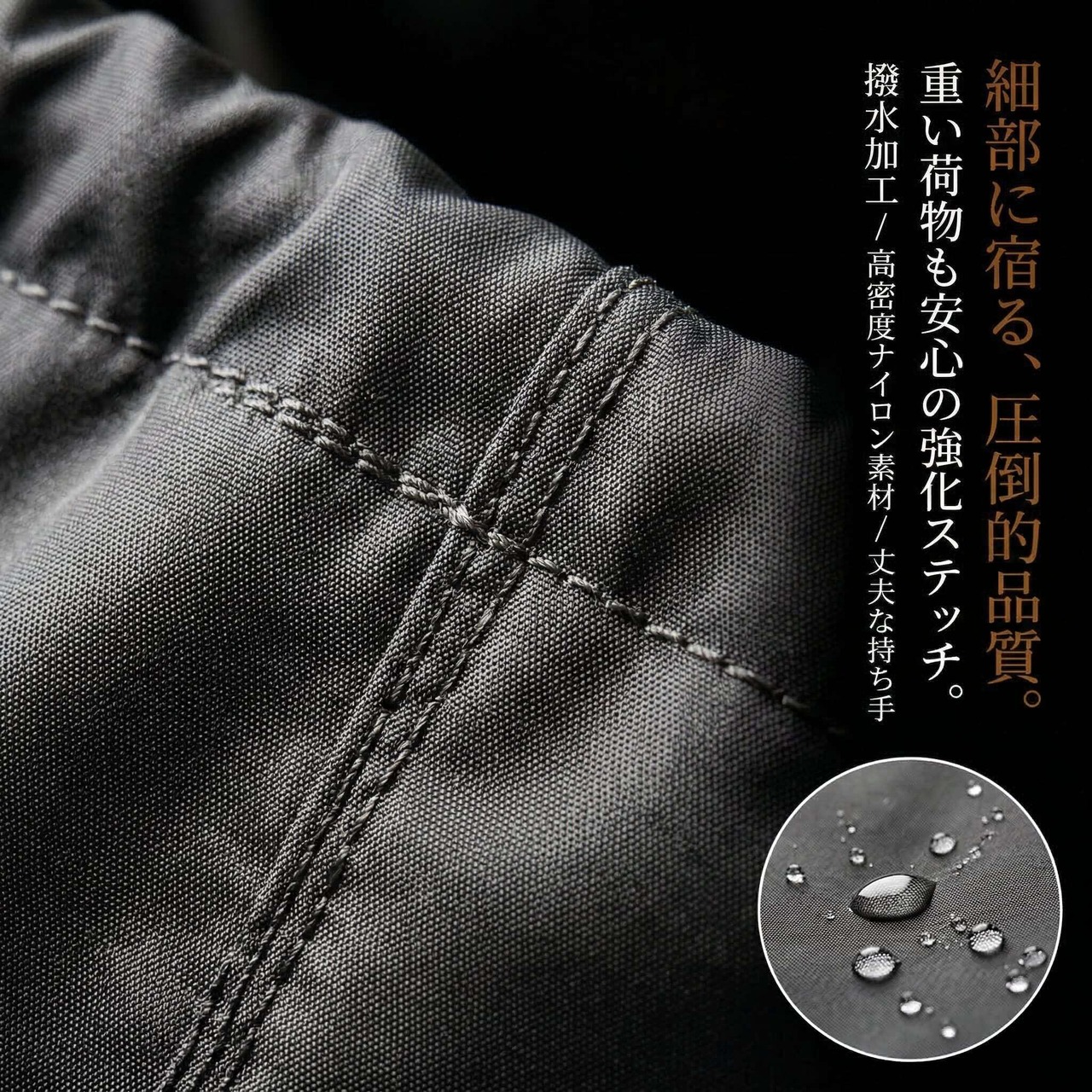 荷重のかかる部分は強化ステッチで補強。重い荷物を入れても安心して使える、細部までこだわった品質です。