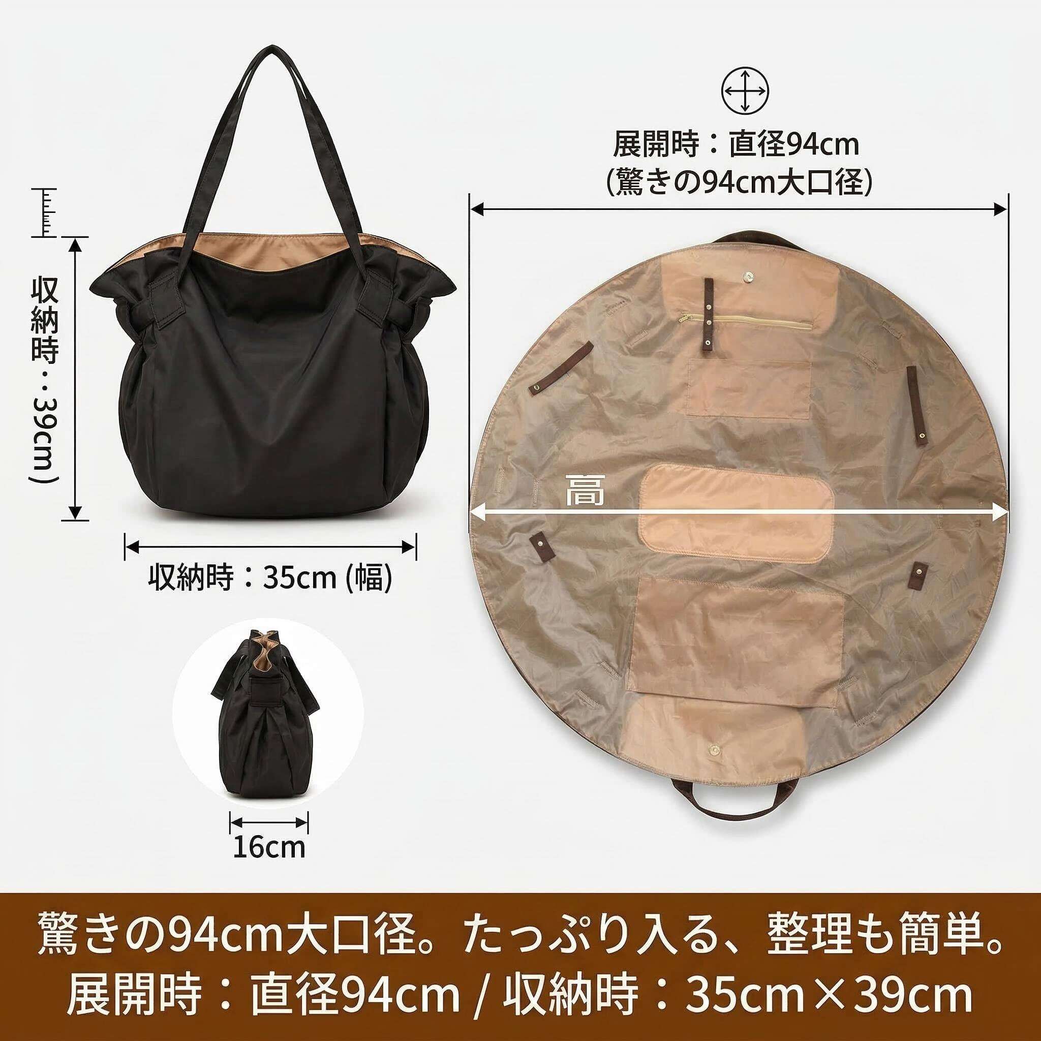 広げれば直径約94cmの大容量。使わないときはコンパクトに折りたたんで収納。