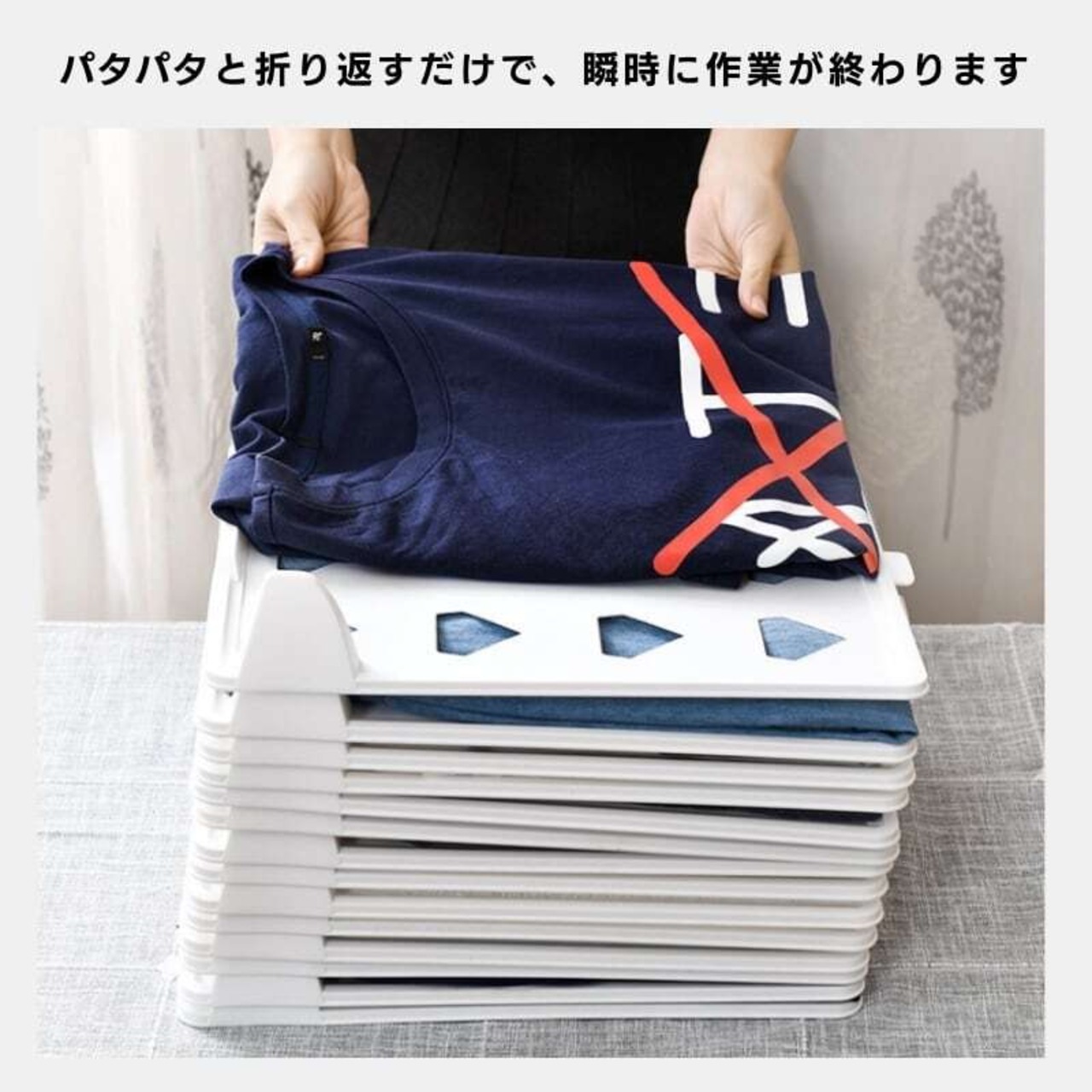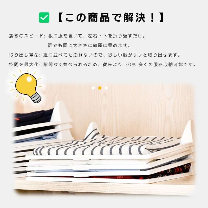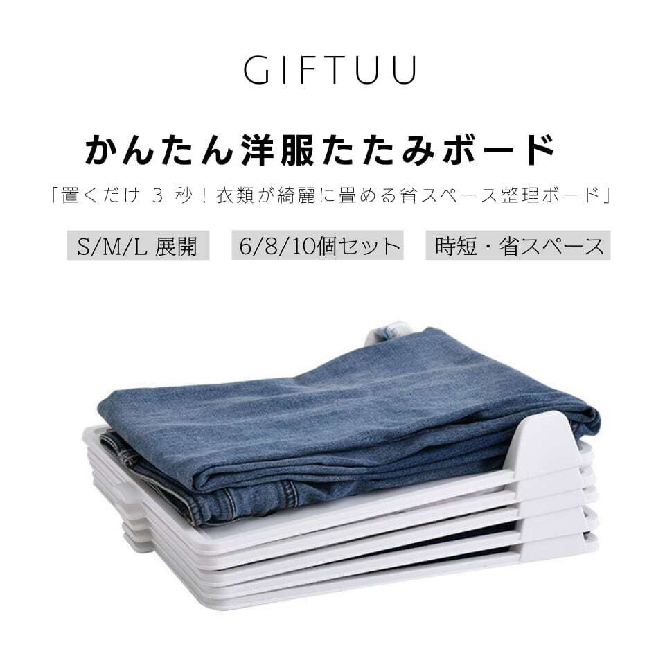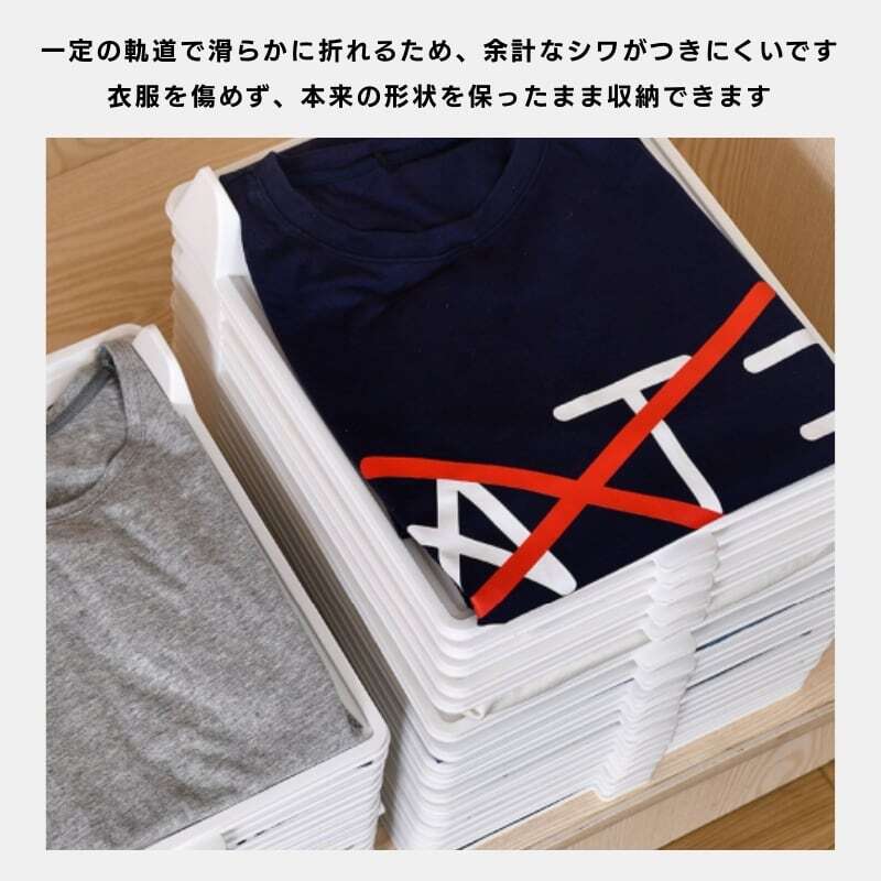 板に服を置いて、左右と下を折り返すだけ。手順はたったこれだけ。誰でも簡単に、同じ大きさにきれいに畳めます。忙しい朝の時短にもぴったりです。