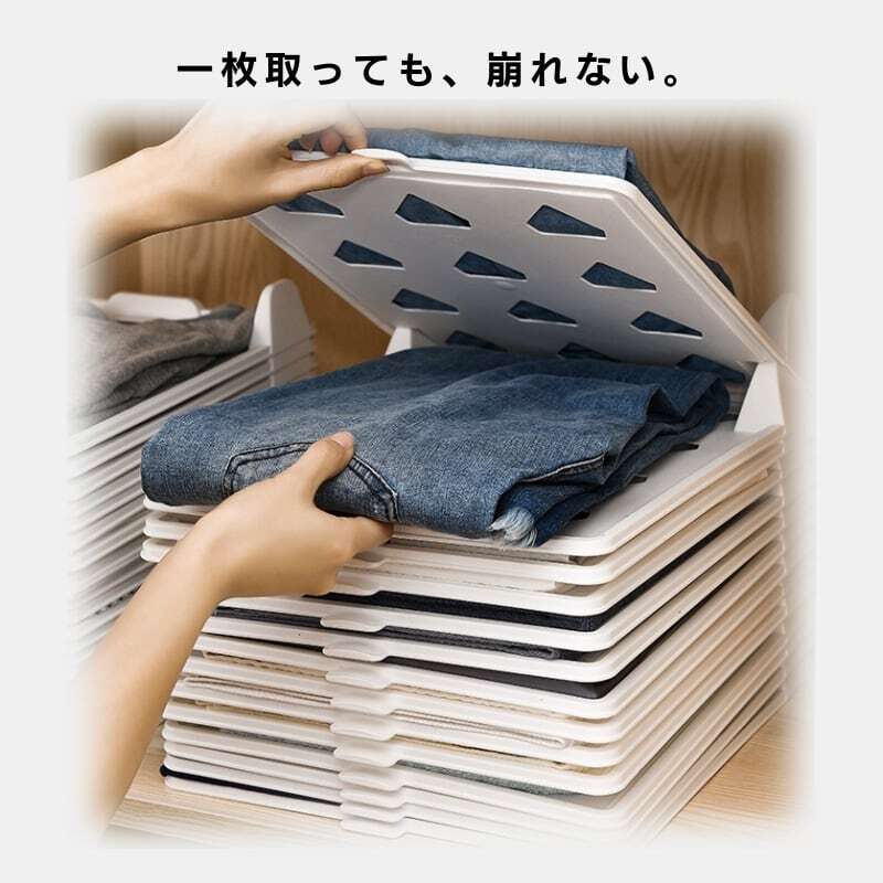 縦に積み重ねても崩れないので、欲しい服だけをサッと取り出せます。下の方の服を取り出しても、上の服が崩れてこないストレスフリーな設計です。