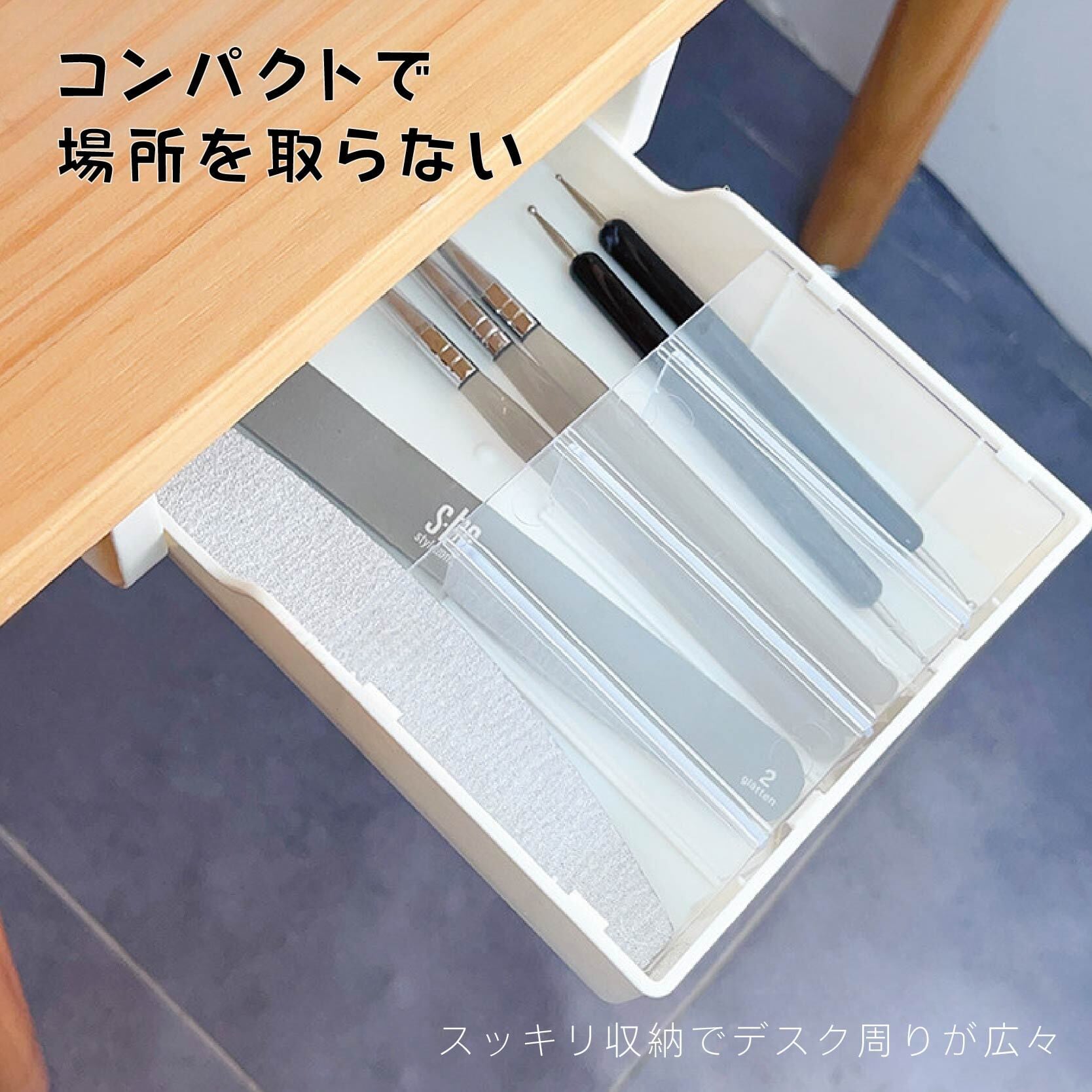 仕切り板付きで、中身が動きにくく、小物を種類別に整理できます。仕切りは位置を自由に変えられるので、収納するものに合わせて調節可能です。