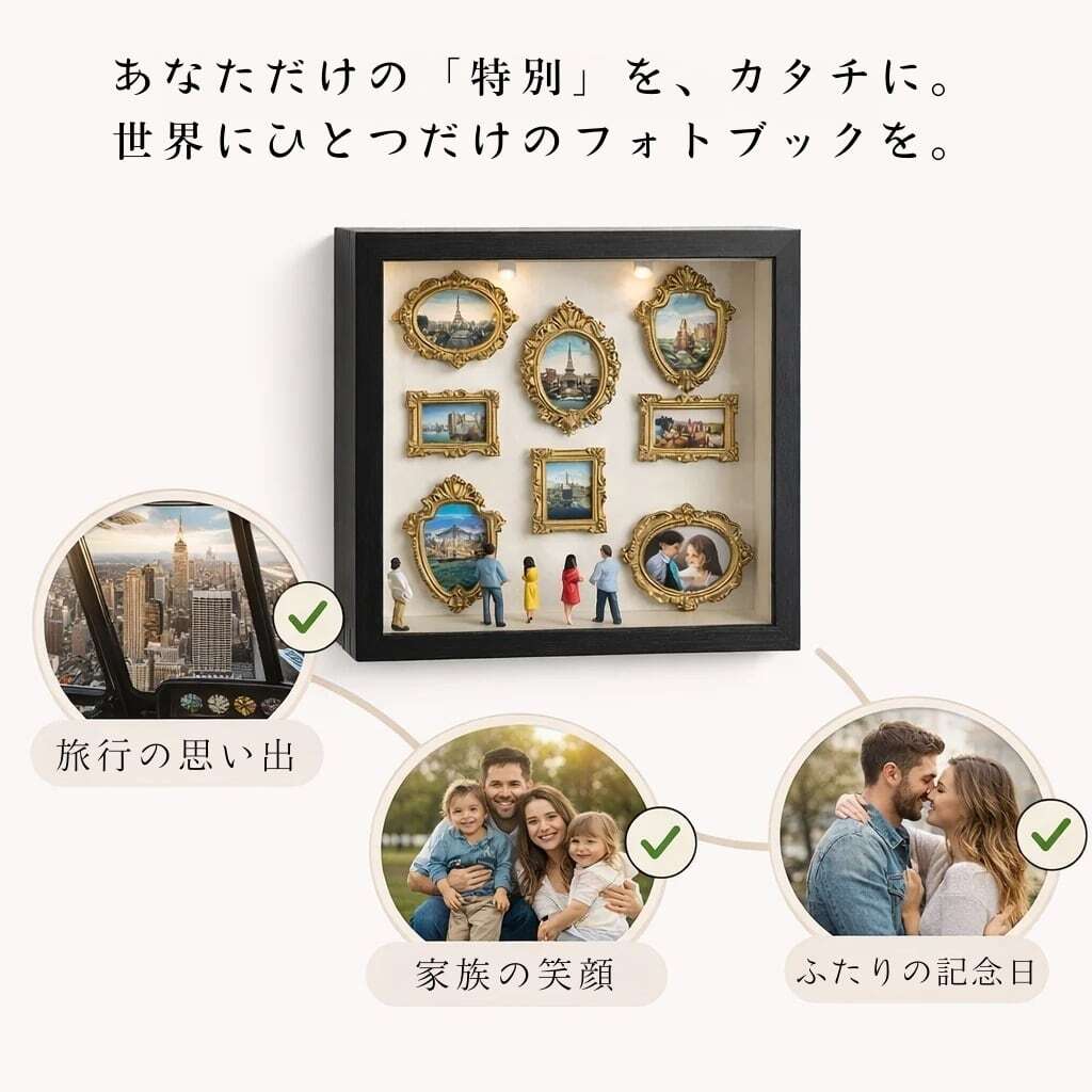 ただ写真を貼るだけではありません。ミニチュアの観客たちがあなたの思い出を見守る、まるで本物の美術館のような情景が完成します。 旅先の風景、家族の笑顔、二人の記念日…。厳選されたクラシカルなゴールドのミニフレームと、愛らしいフィギュアが、何気ない日常にドラマチックなストーリーを添えます。