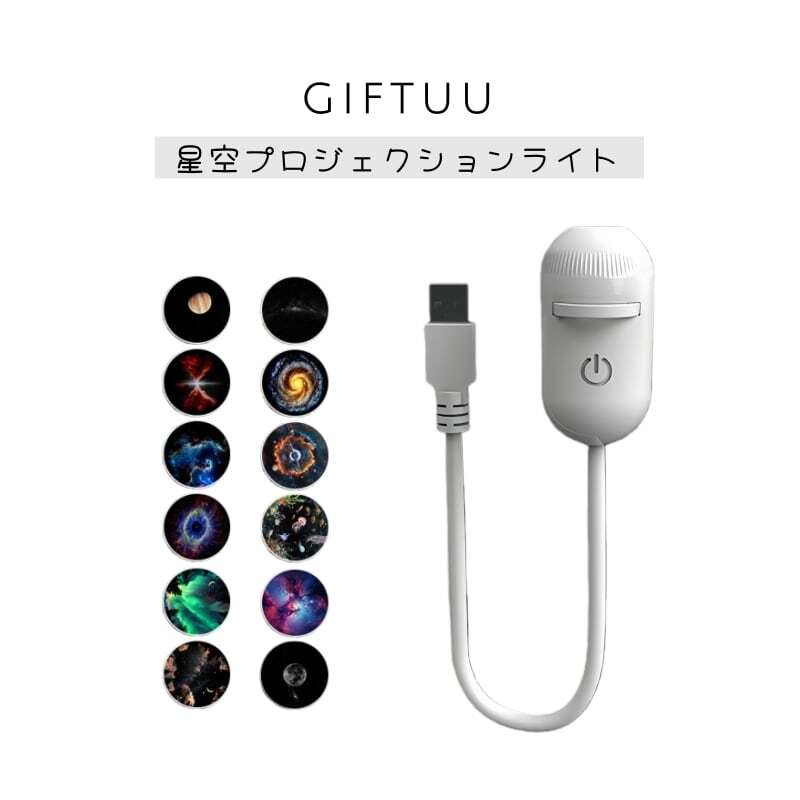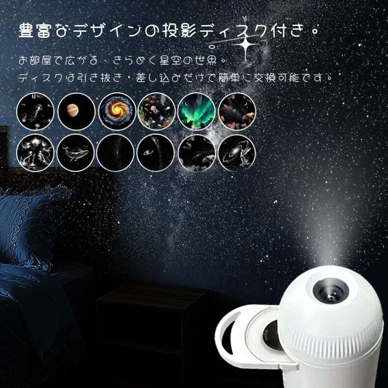 天の川、月、土星、星雲、オーロラ、幻想的な模様など、12種類の投影ディスクが付属。お好みでディスクを交換すれば、お部屋の雰囲気を簡単に変えられます。ディスクは「抜き差し」だけで簡単に交換可能です。