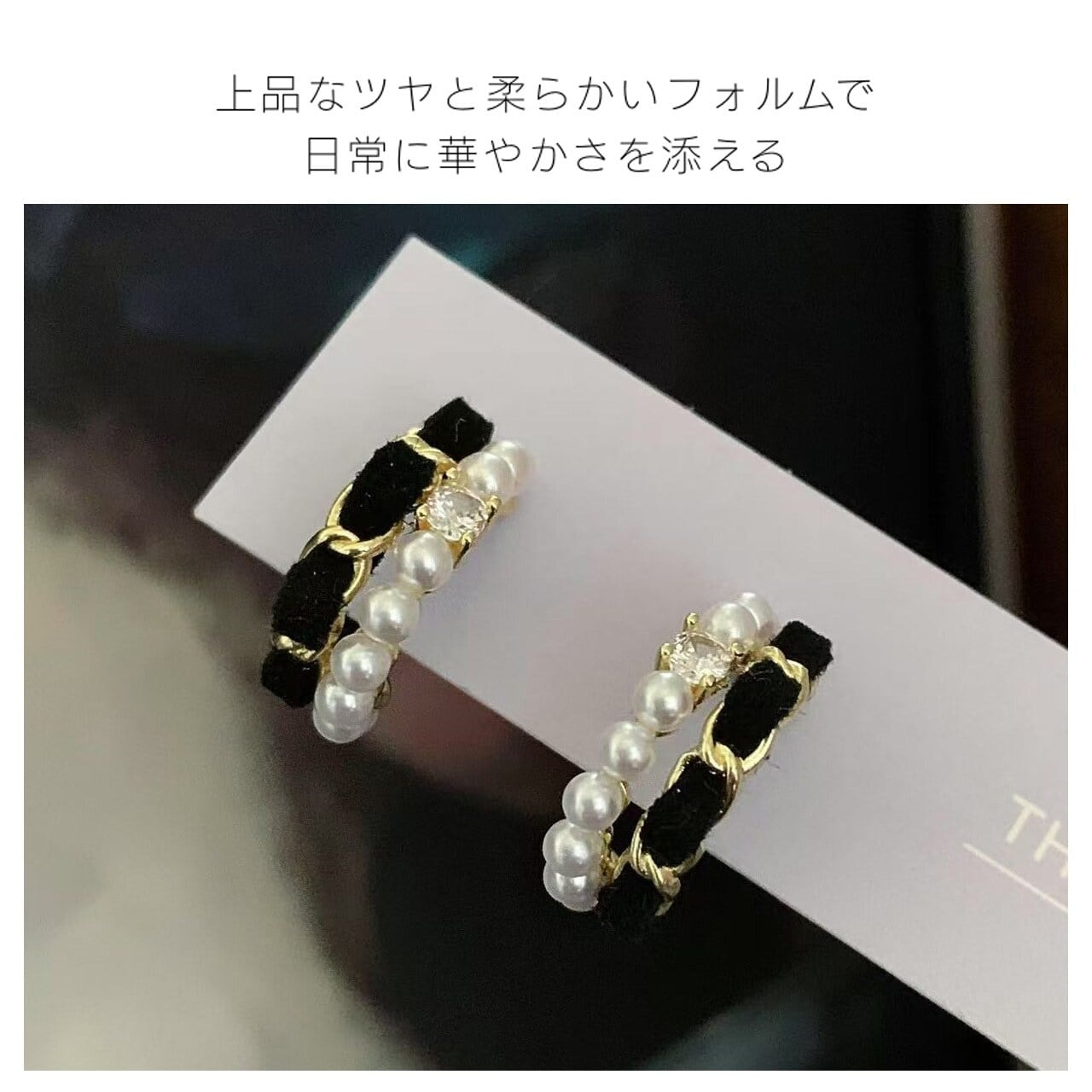 シンプルなC型シルエットが耳元を優しく包み込み、顔のラインを引き締める効果があります。ブラックベロアの柔らかい質感が手作りの温もりを伝え、中央に配置された真珠は上品な光沢を放ち、過度な華やかさを避けつつ存在感を演出します。