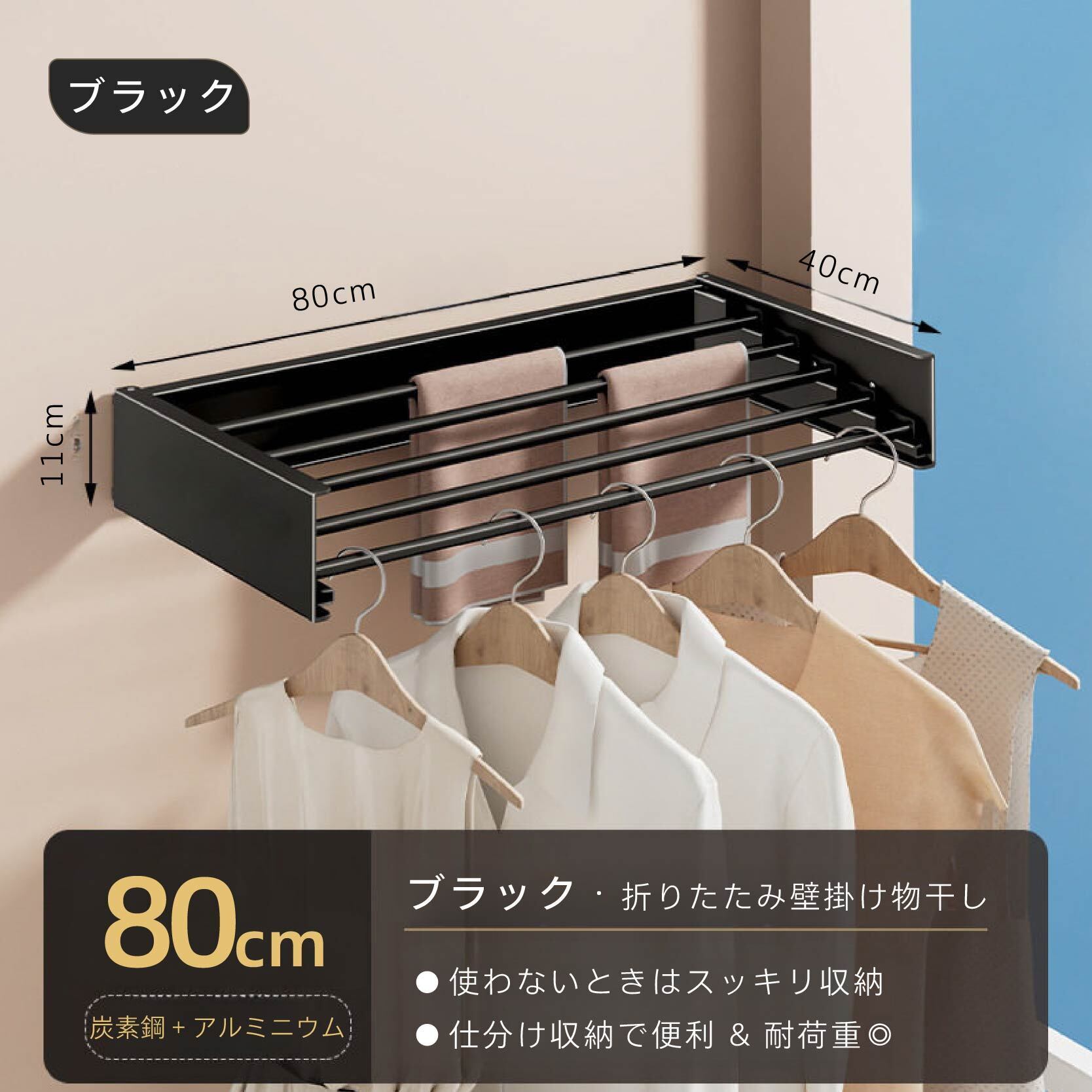 Y 392 . 2【折りたたみ式・壁掛け】物干し 5本掛け杆 耐荷重 防錆加工 80/100 cm ブラック/ホワイト 接着式 免打孔