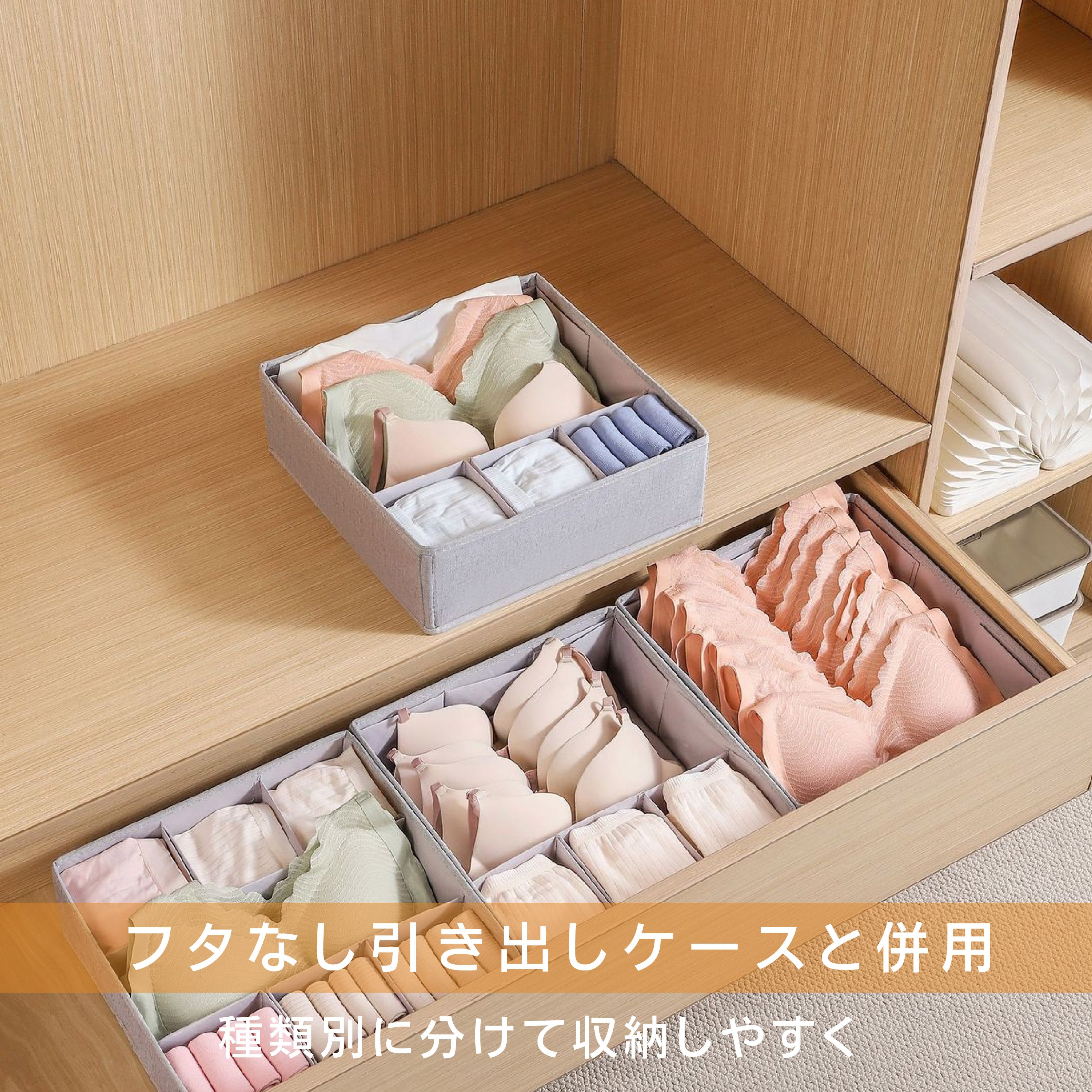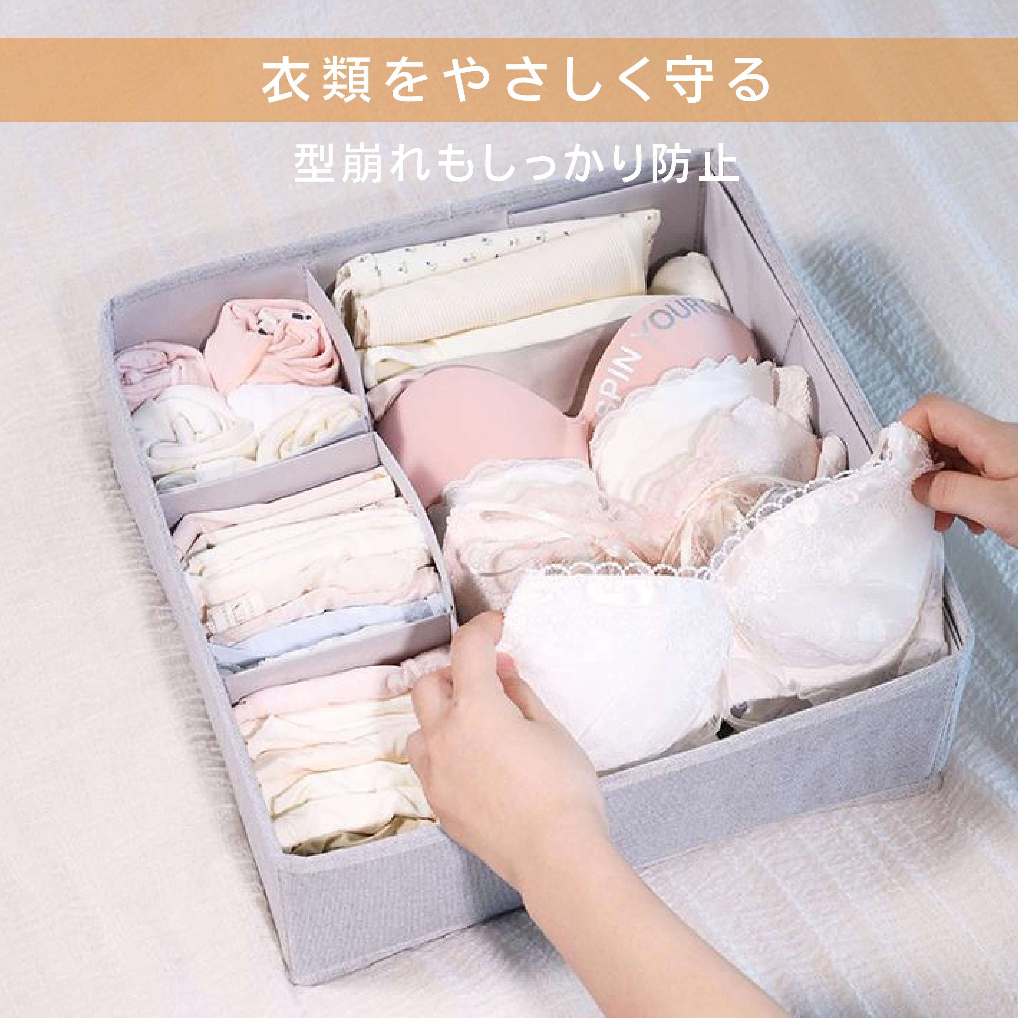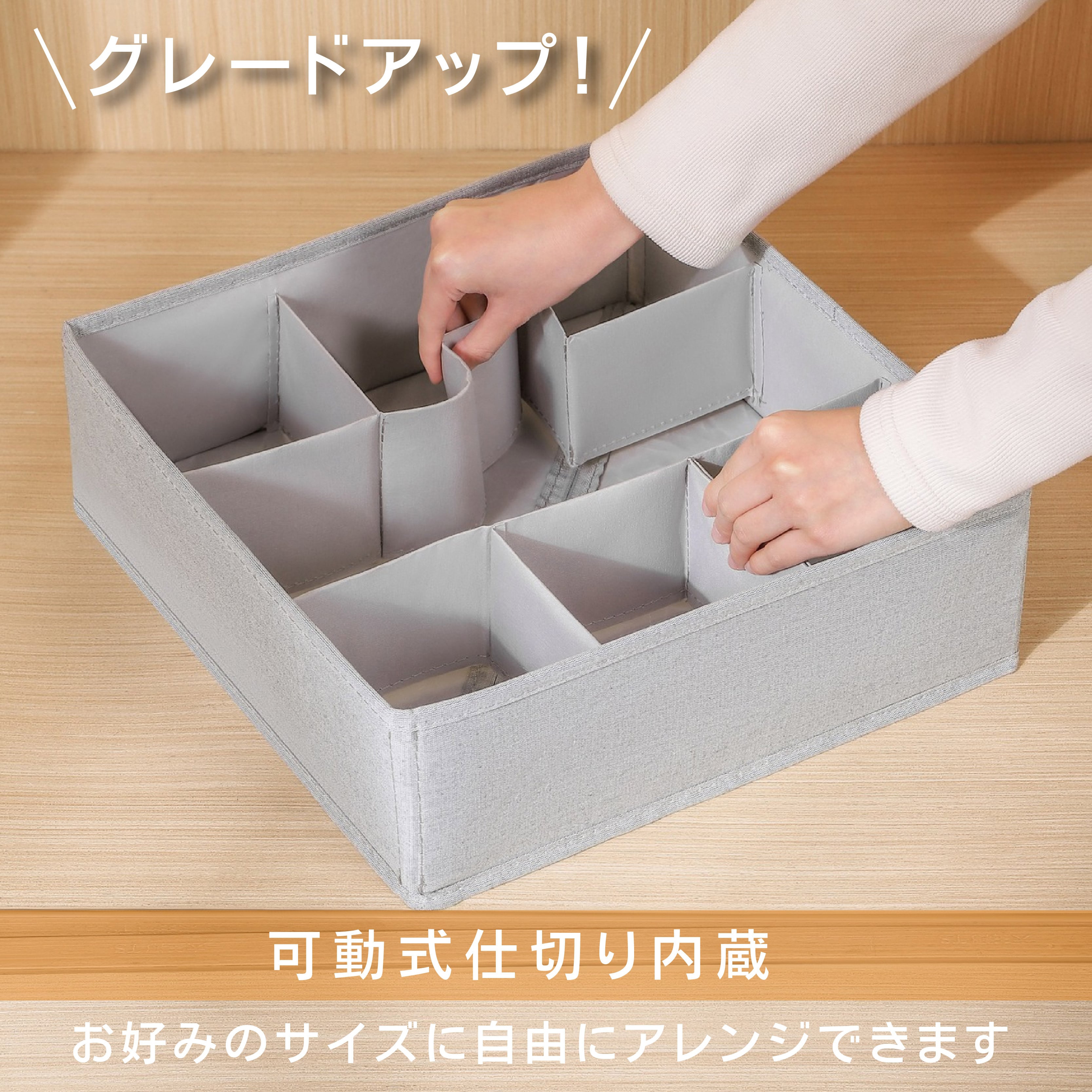 7マスの仕切りは、収納するものに合わせて自由に調節可能。下着、靴下、ハンカチ、Tシャツなど、種類別に整理整頓できます。