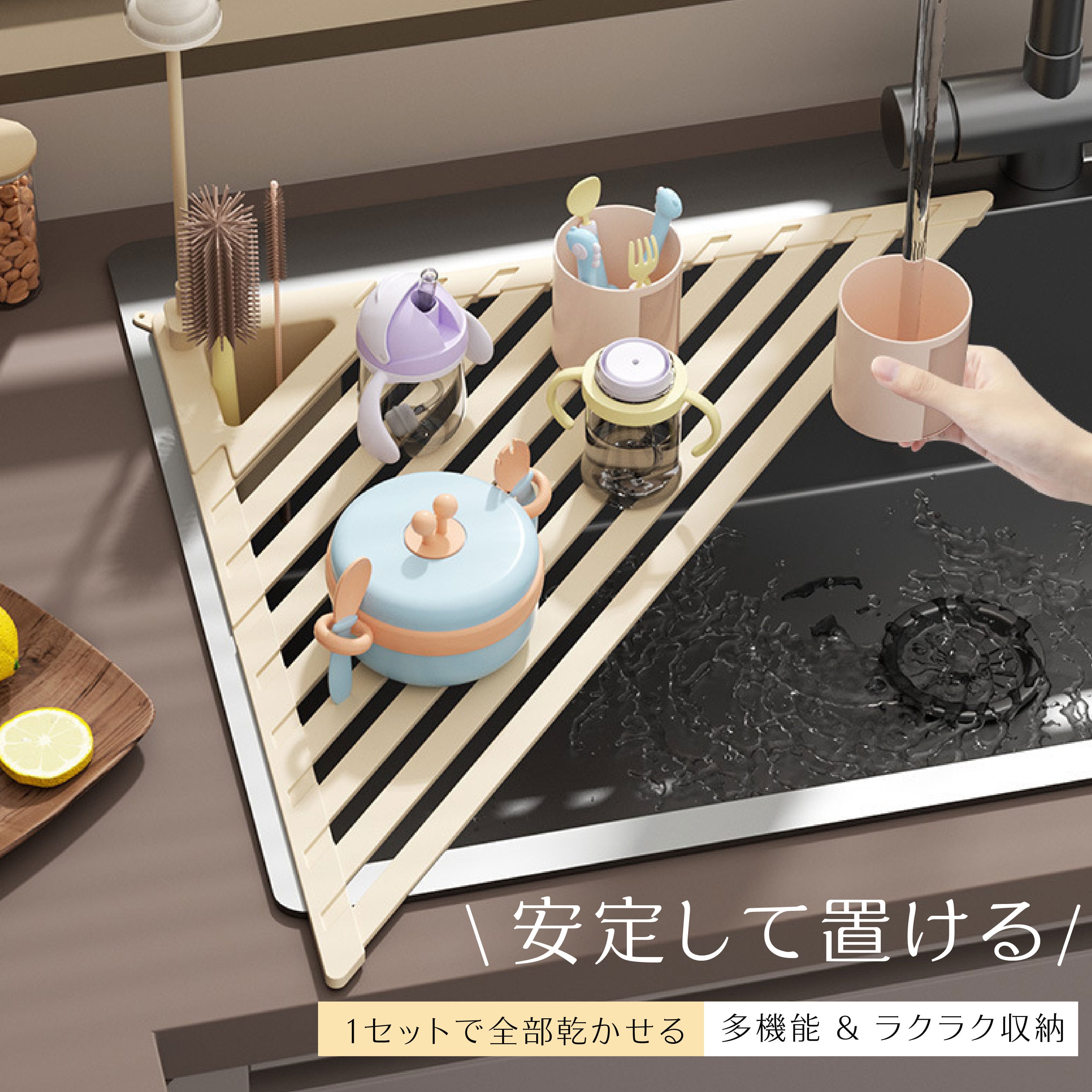 ドライバーやネジ、接着剤は一切不要。シンクの角に置くだけで即座に使用開始できます。