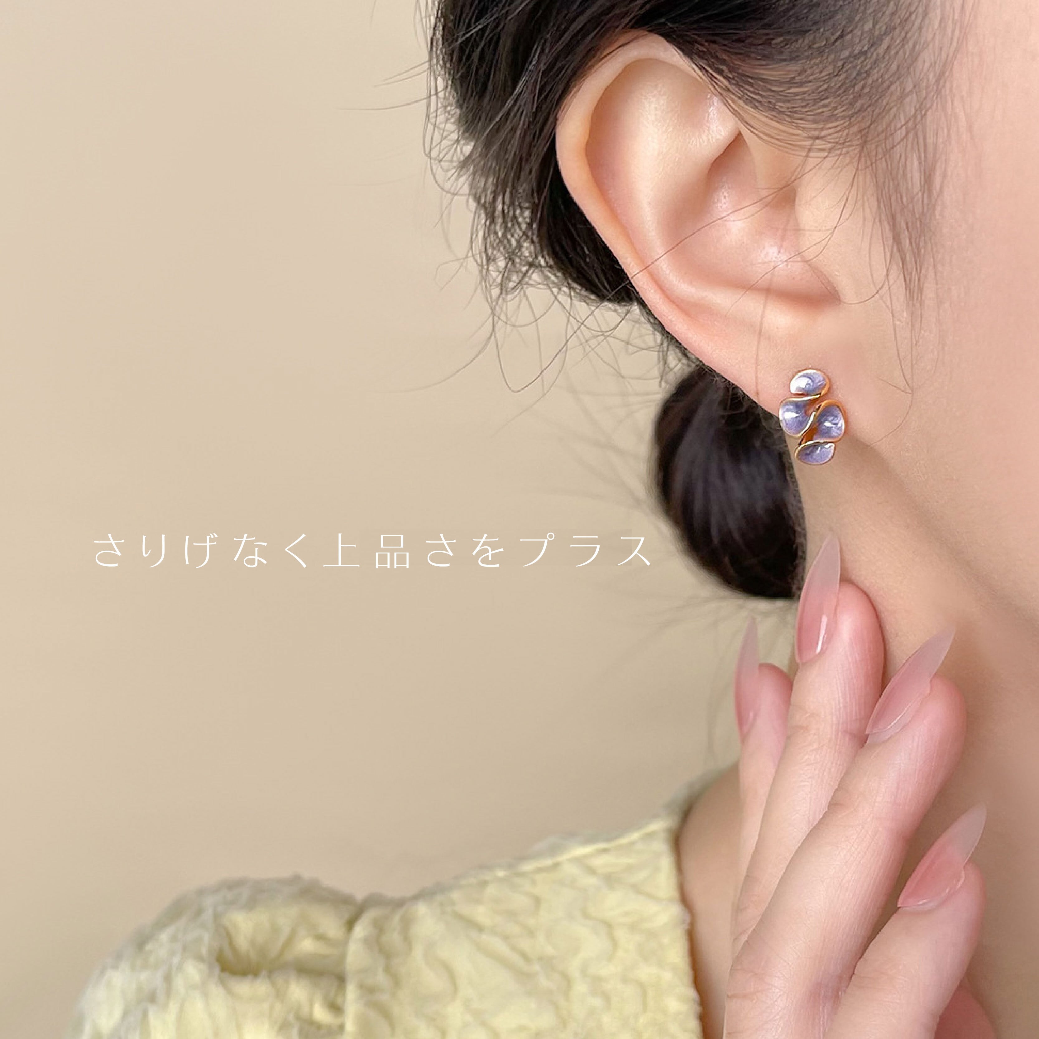 一体型シリコンクリップを採用しているので、ピアス穴がなくてもお使いいただけます。軽量2.2gで、長時間着用しても耳が痛くなりにくい設計。4色展開で、コーディネートに合わせてお選びいただけます。
