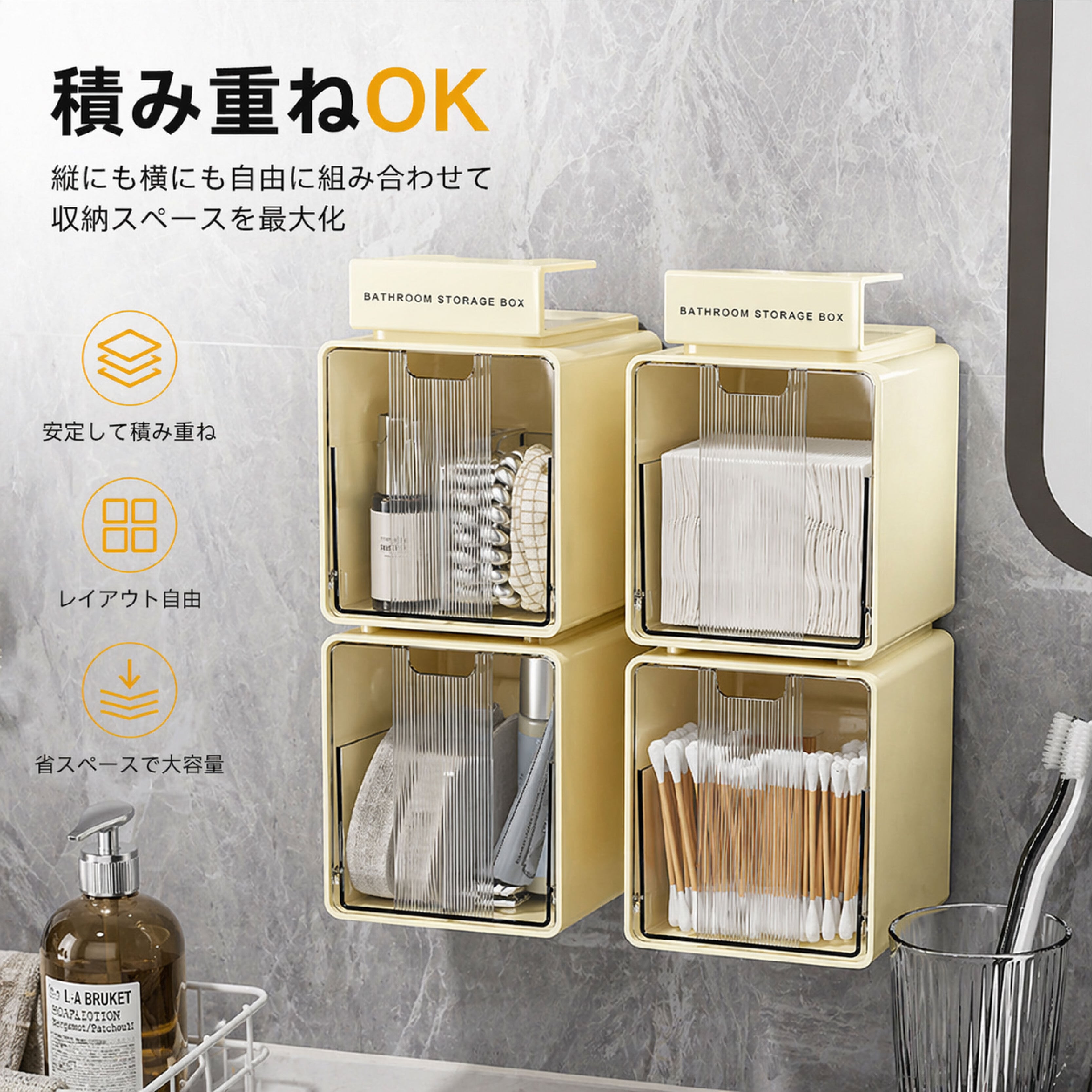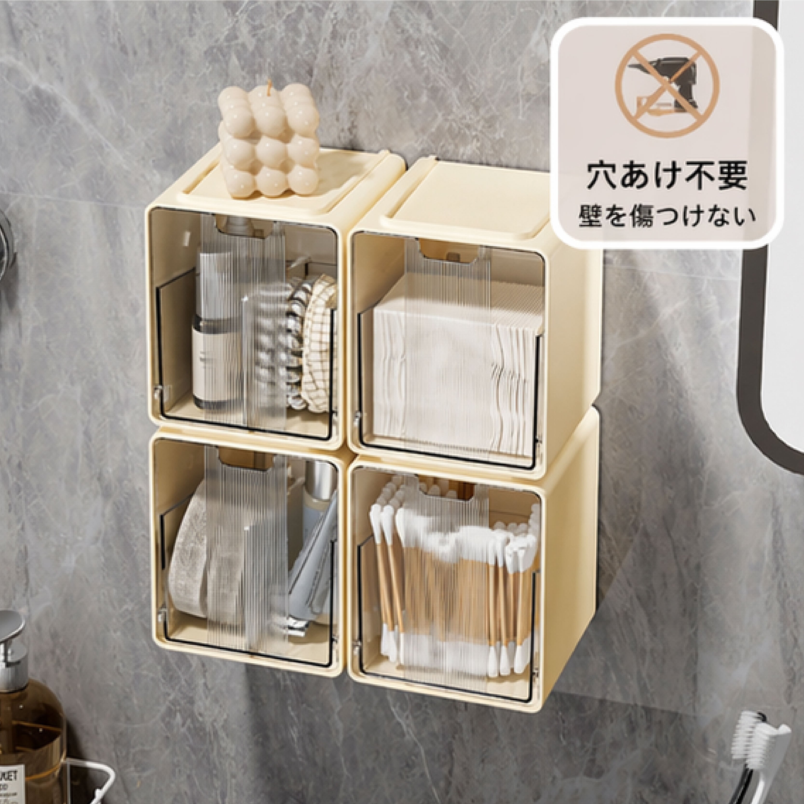 Y 113 . 【3個セット】鏡櫃収納ボックス フック式/吊り下げ式 ホワイト/クリームイエロー 工具不要 穴あけ不要 バスルーム 積み重ね可能 洗面所 収納ケース