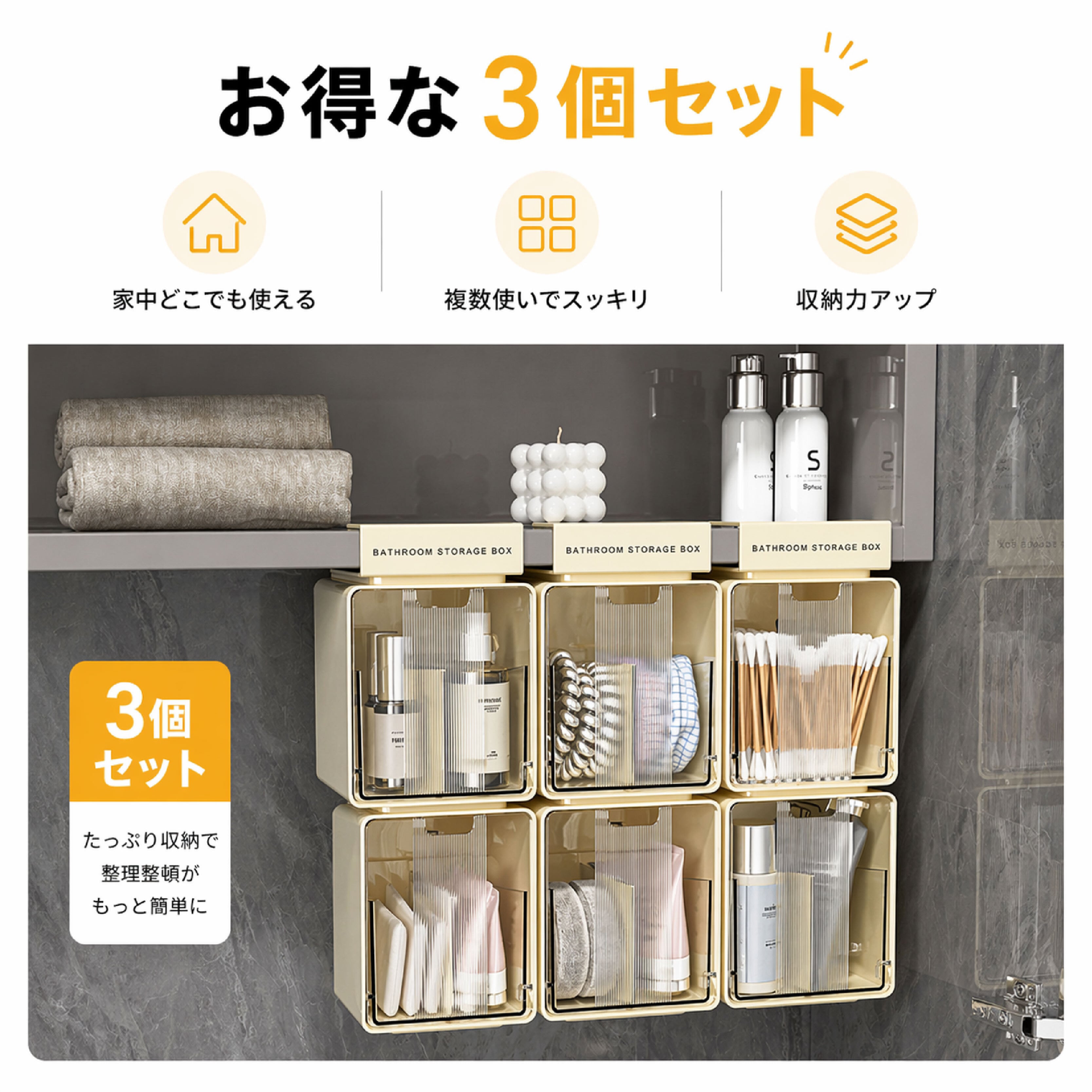 たっぷり収納できる3個セット。洗面所やキッチンなど、複数箇所にまとめて使えます。