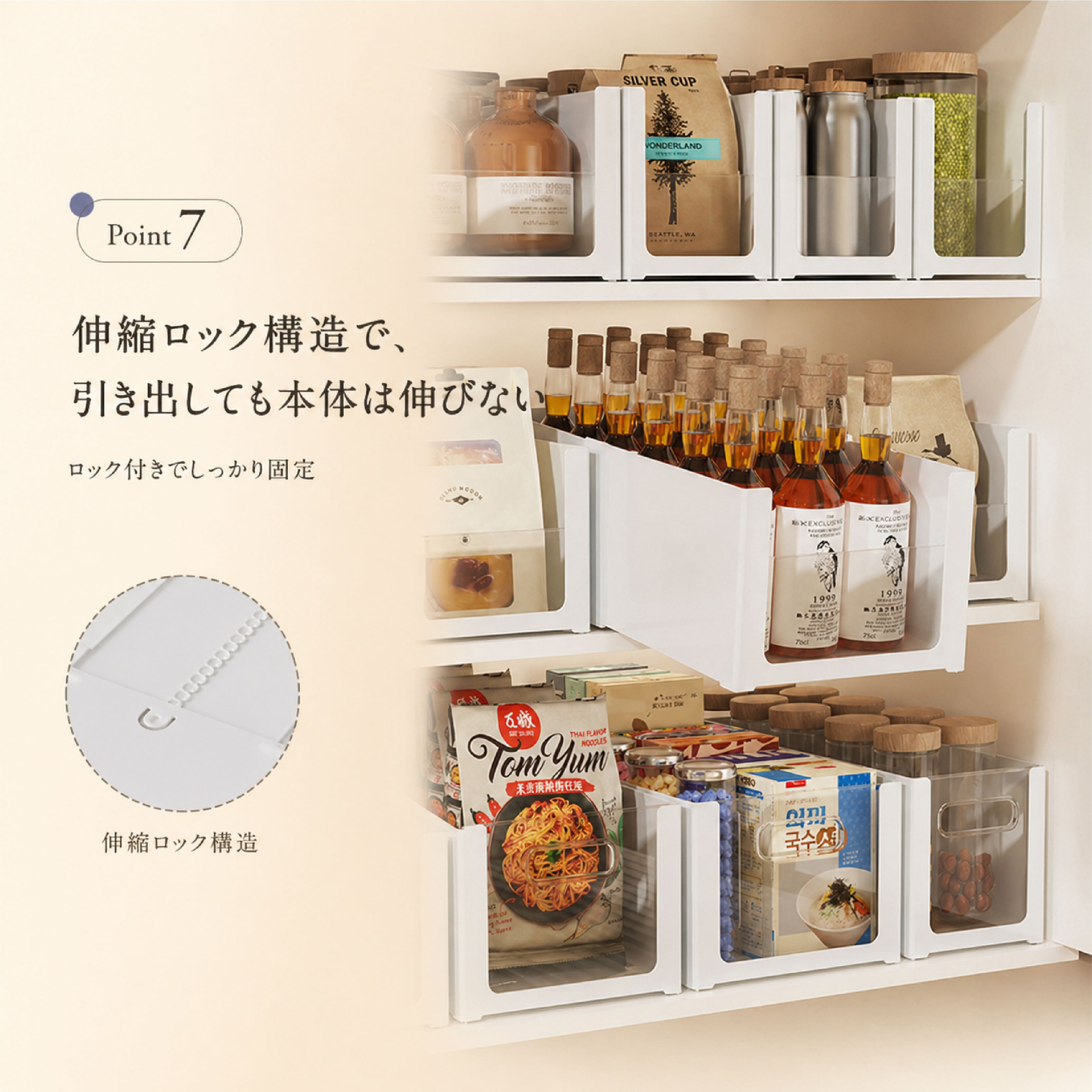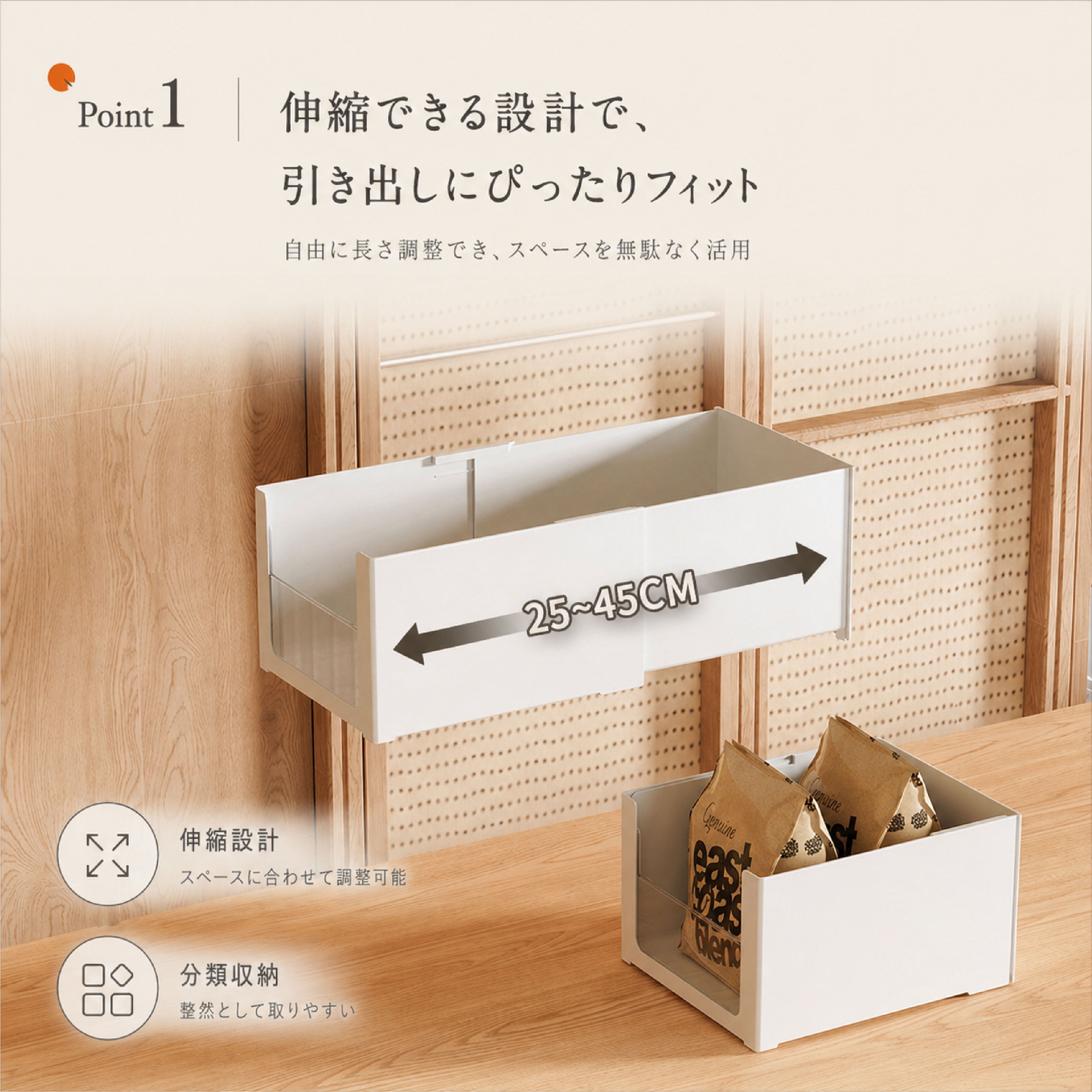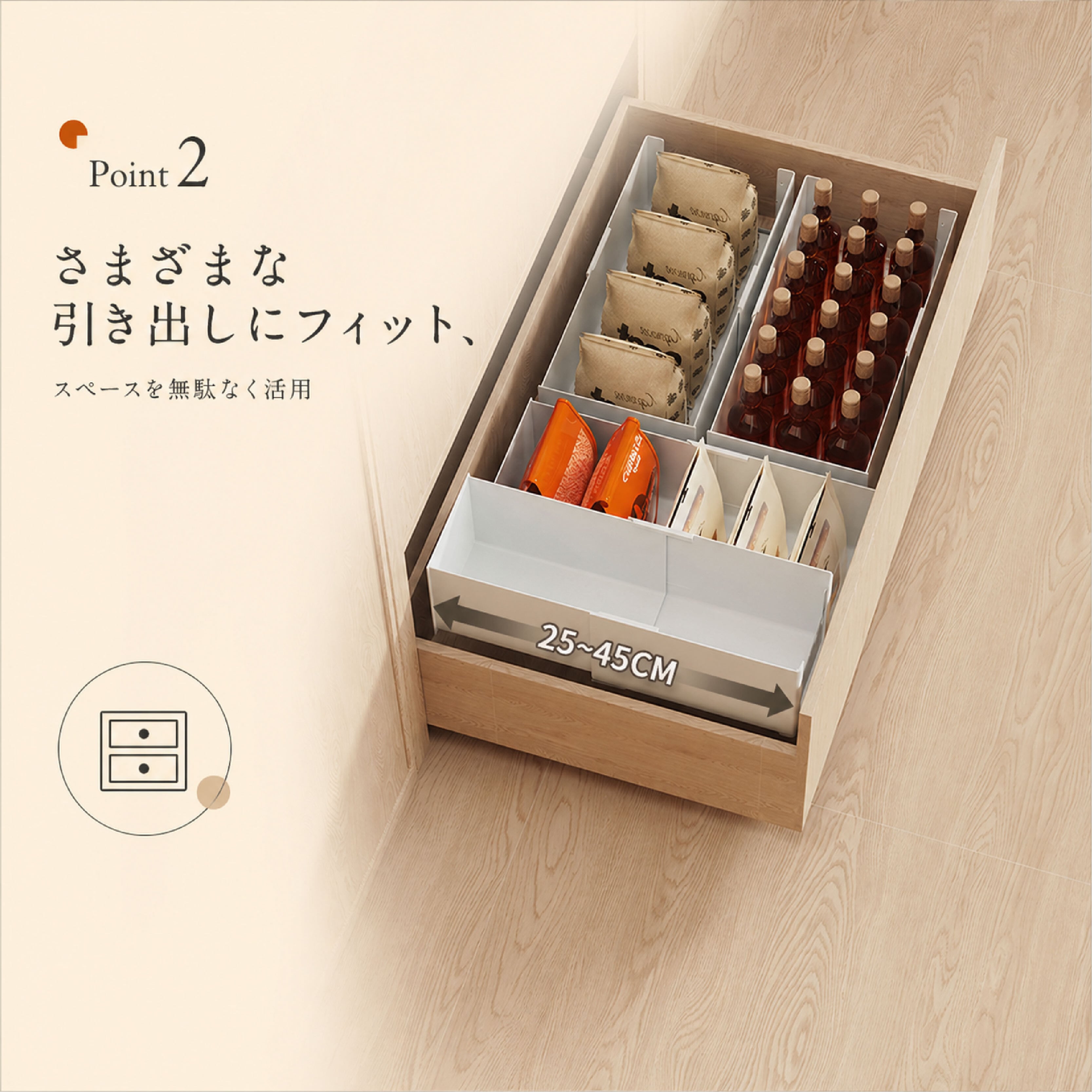 25cm〜45cmまで自由に長さを調整できる伸縮設計で、引き出しや棚のスペースを無駄なく活用できます。透明ボディで中身がひと目でわかり、探す手間を省きます。キッチン、クローゼット、子供部屋など、さまざまな場所で活躍します。