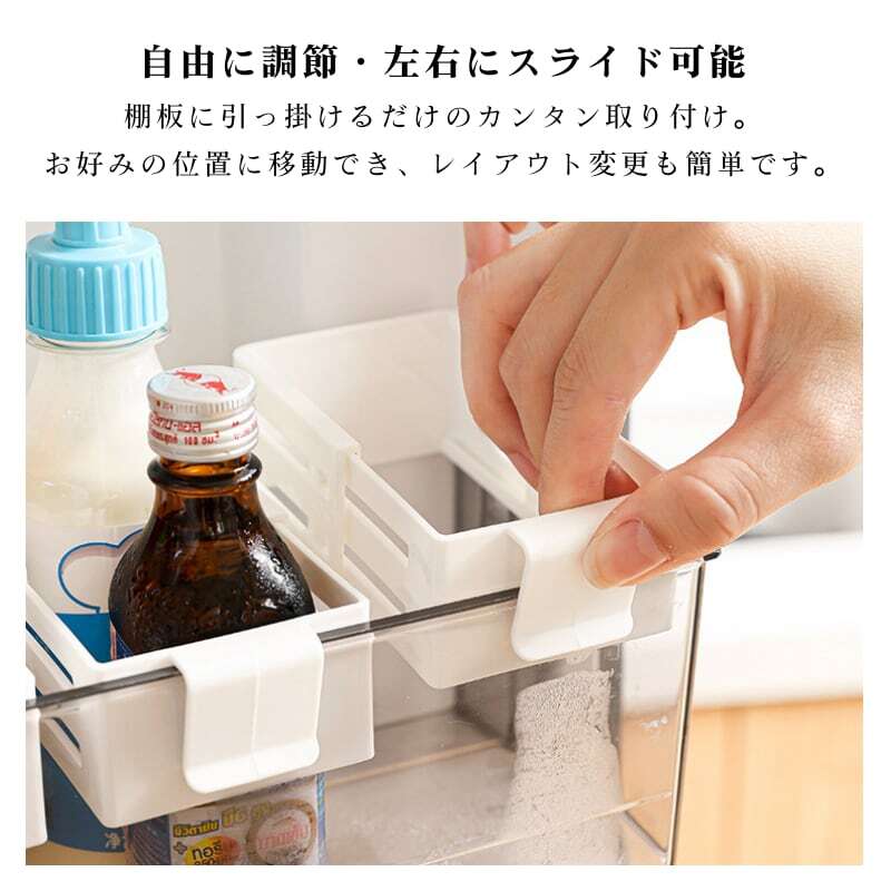主な使用シーン:冷蔵庫内(棚下、ドアポケット)、キッチン収納、文具・化粧品・医薬品の整理など