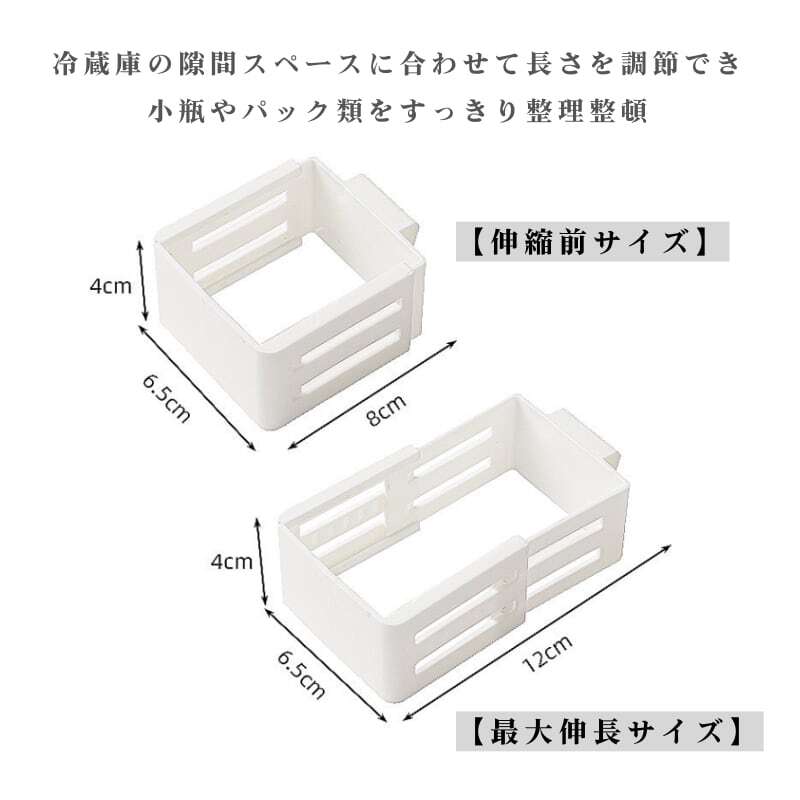 冷蔵庫の棚板の高さや、ドアポケットの奥行きに合わせて、長さを自由に伸縮調節可能(約8〜12cm)。無理な力がいらず、ストレスなく隙間を有効活用できます。
