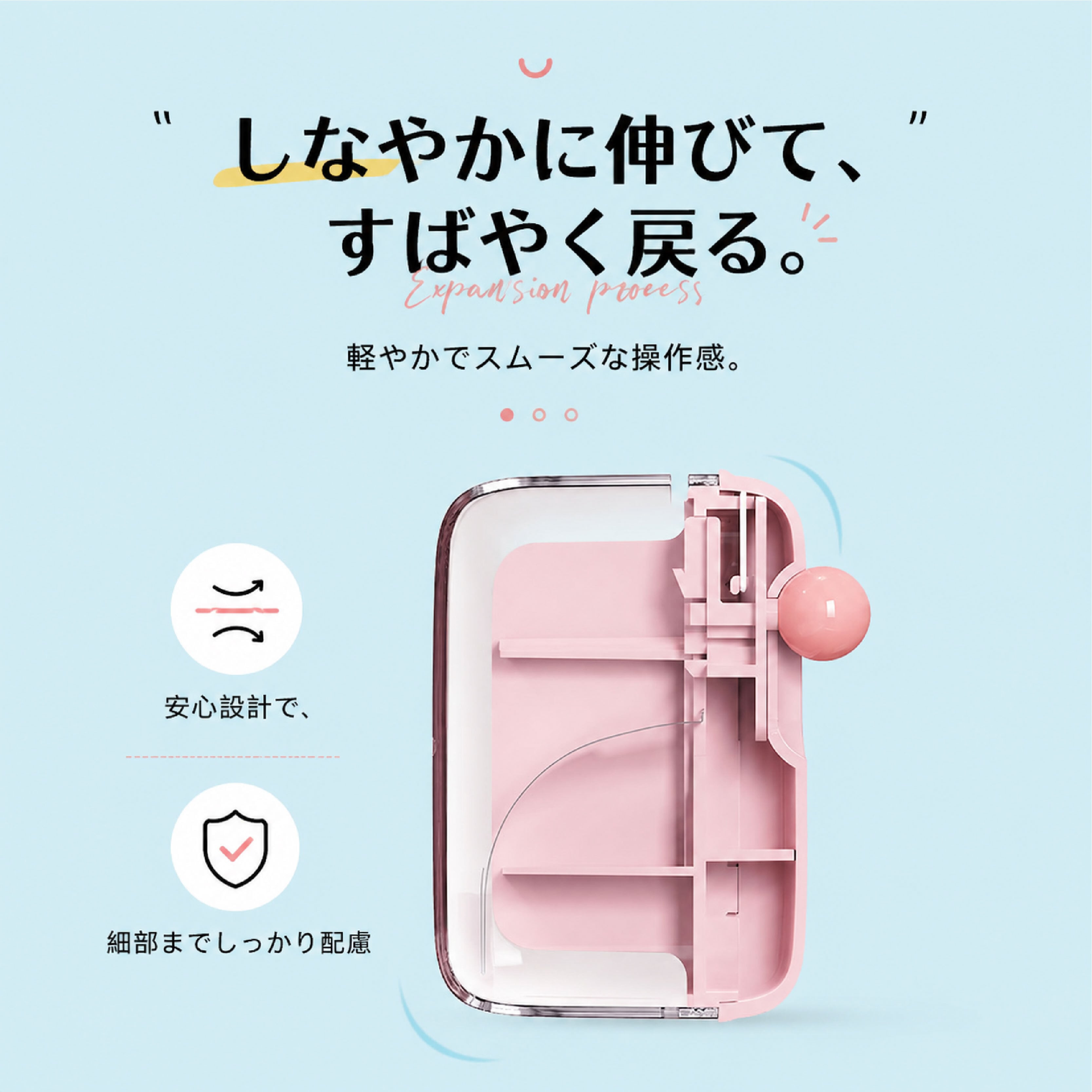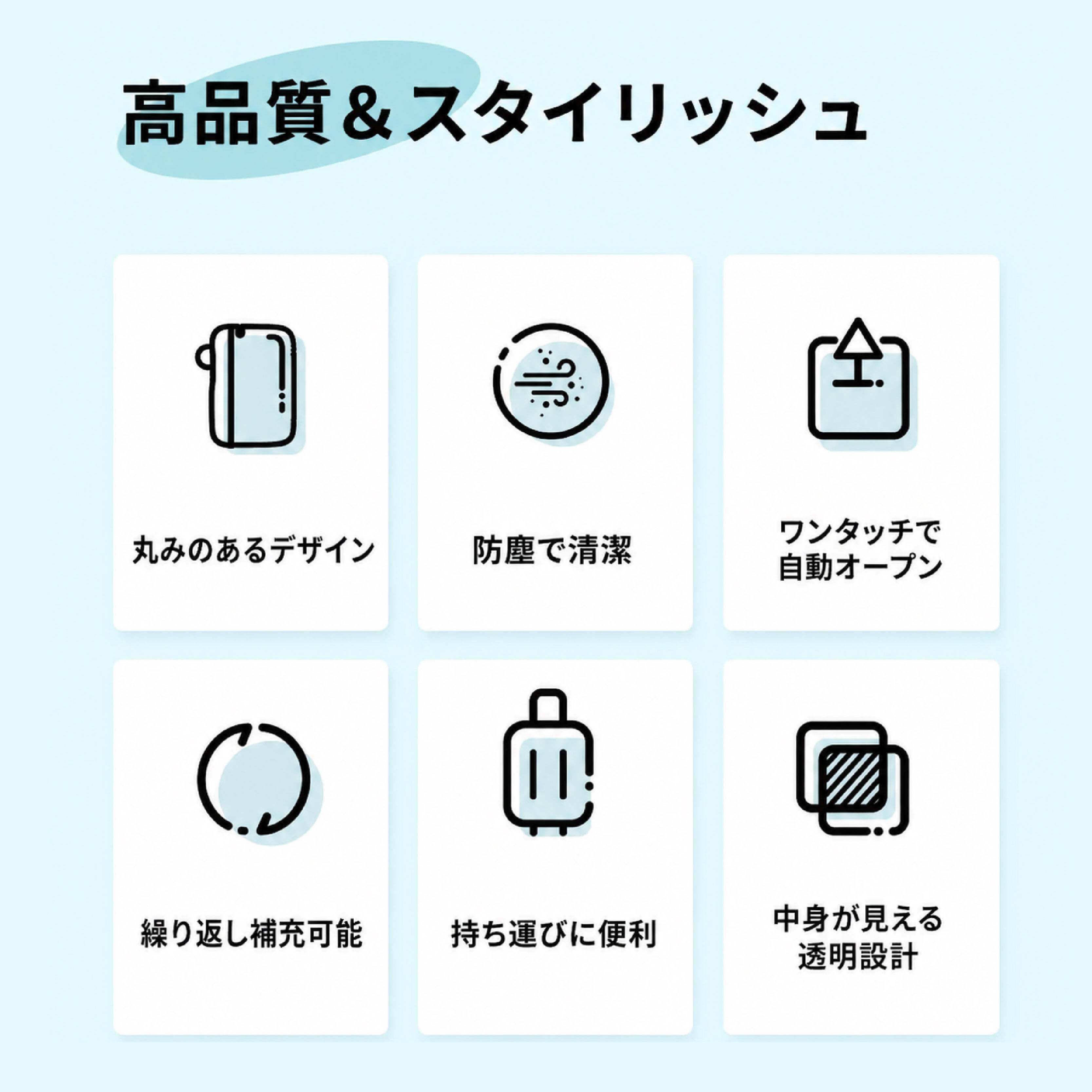 防塵・密閉設計で、ホコリや雑菌の侵入を防ぎ、清潔をキープ。透明ボディで中身がひと目でわかります。コンパクトで軽量なので、持ち運びにも便利。繰り返し補充可能で、長くご愛用いただけます。